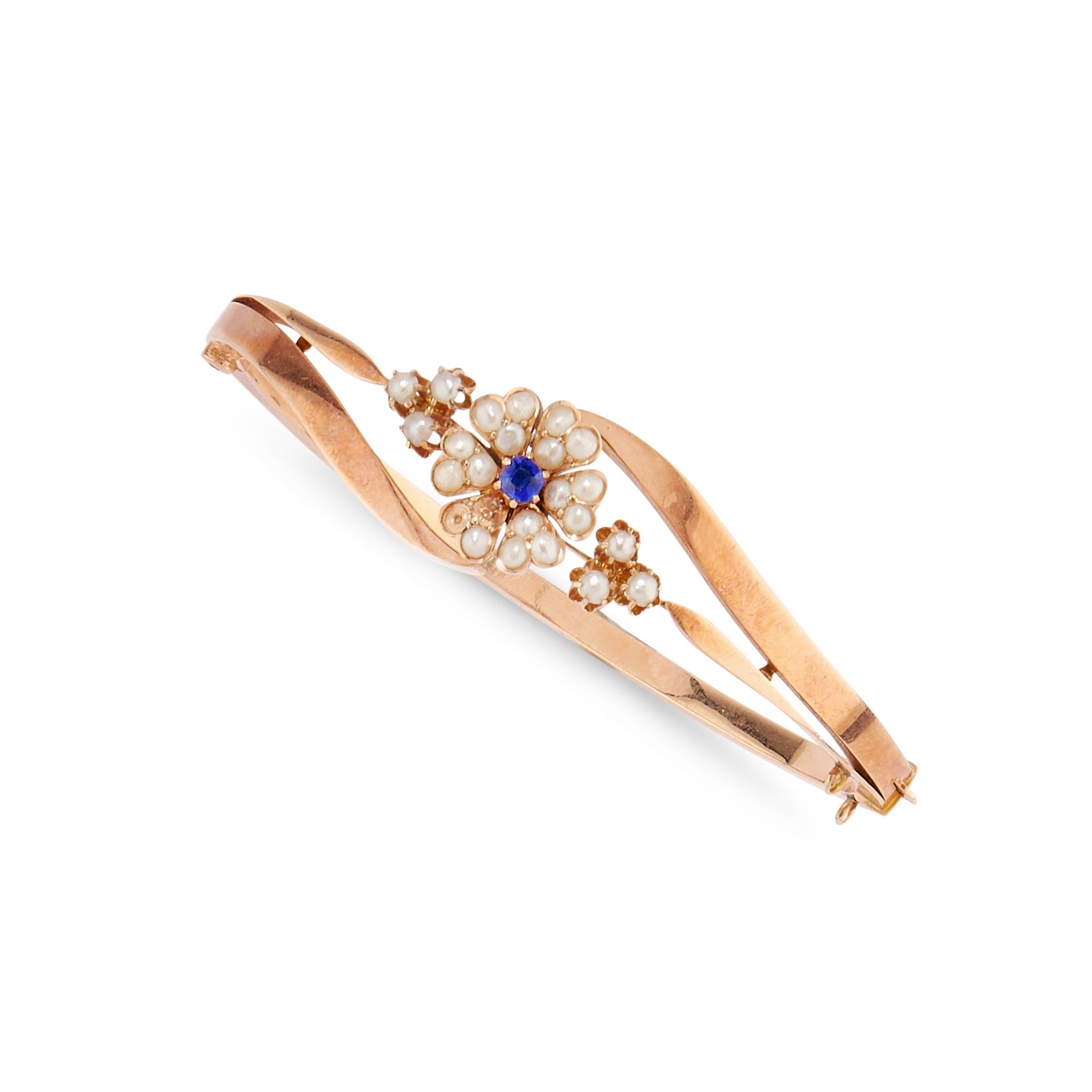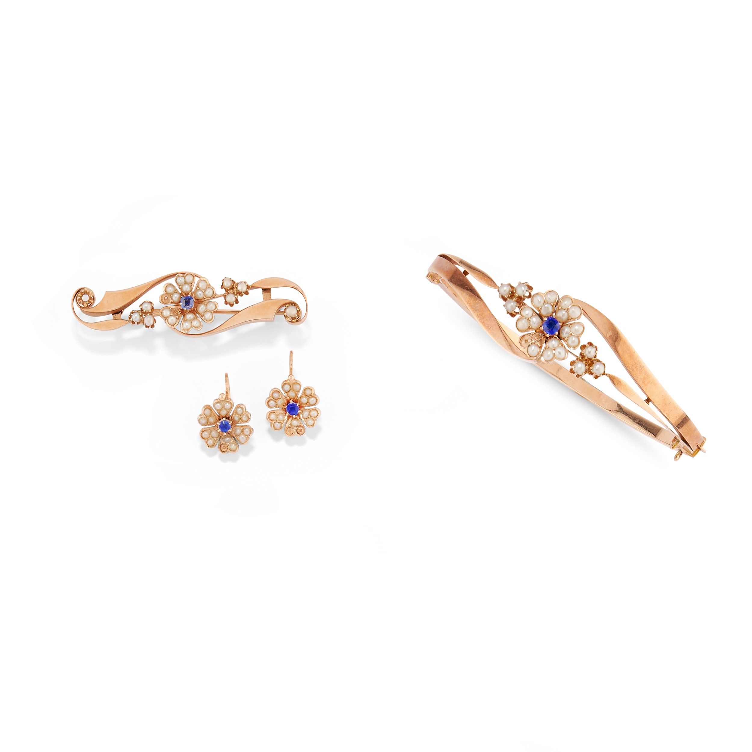 motivi a fiore impreziositi da microperle e zaffiri sintetici taglio rotondo, composta da bracciale rigido, spilla e coppia di orecchini con chiusura a monachella e clip, difetti (alcune microperle mancanti).