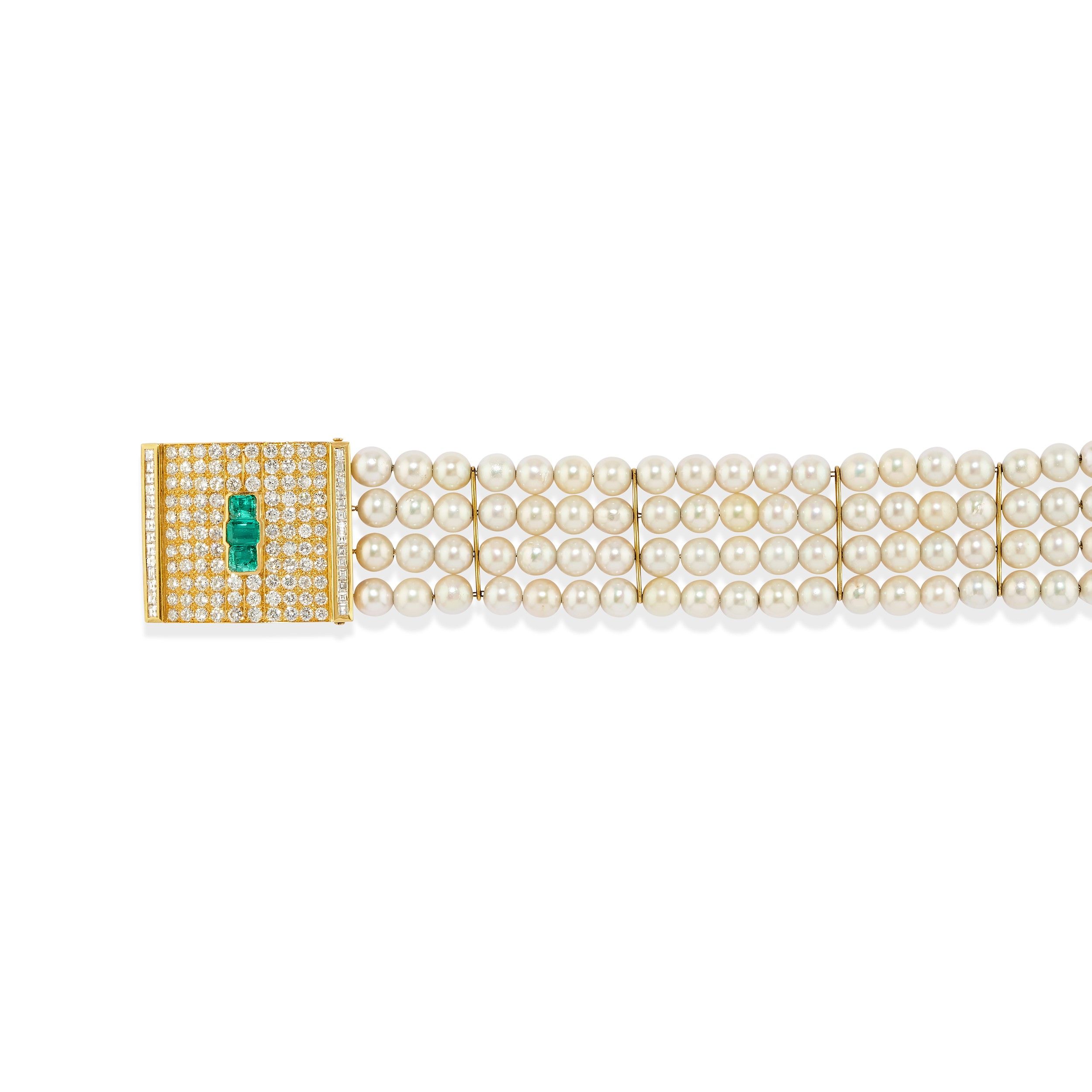 composta da collana a quattro fili di perle coltivate di mm 8,00/8,50 circa, chiusura sfilabile con smeraldo taglio rettangolare a contorno ottagonale di ct 5,80 circa contornato da diamanti taglio carré e brillante per totale ct 10,00 circa e bracciale a quattro fili di perle di mm 8,00/8,50 circa, chiusura sfilabile con tre smeraldi taglio rettangolare a contorno ottagonale per totale ct 2,50 circa, diamanti taglio brillante per totale ct 10,00 circa, difetti (mancanza di materiale ad una perla della collana).