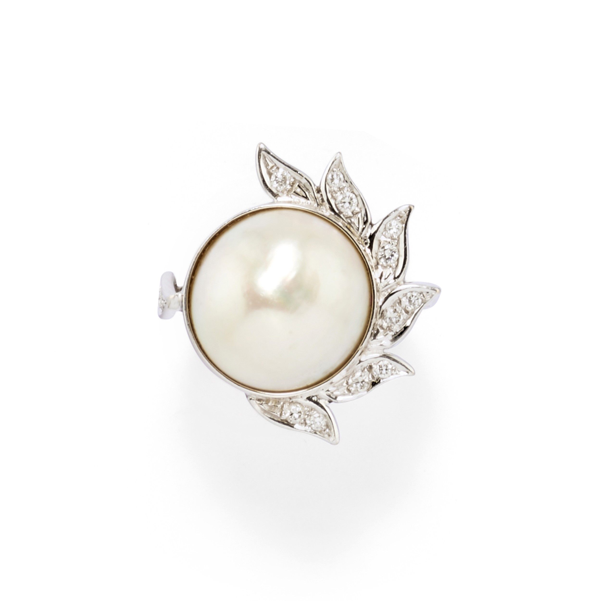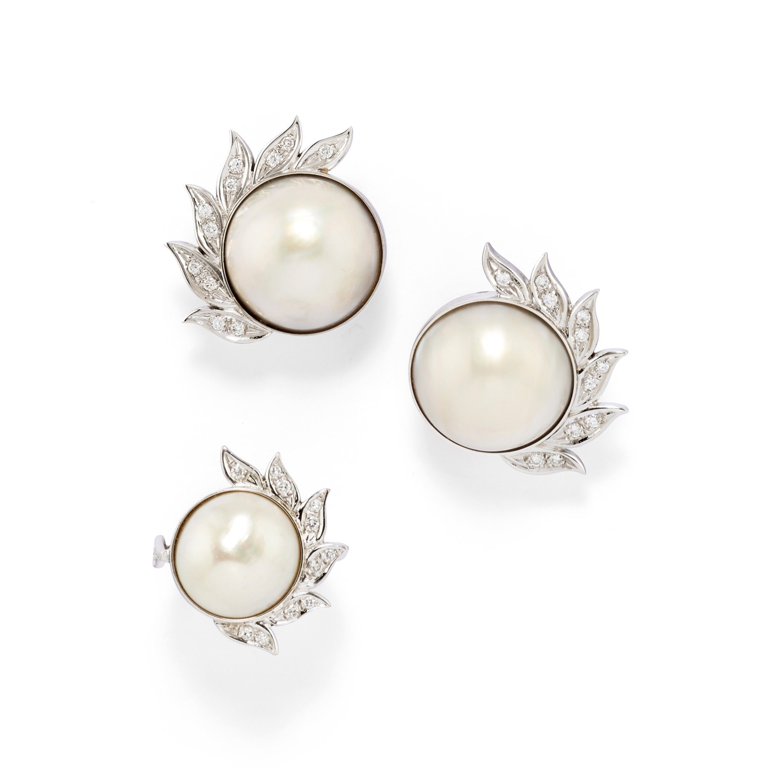 composta da anello e coppia di orecchini con chiusura perno e clip, al centro perle coltivate mabč di mm 17,00/20,00 circa, diamanti taglio brillante per totale ct 1,00 circa.