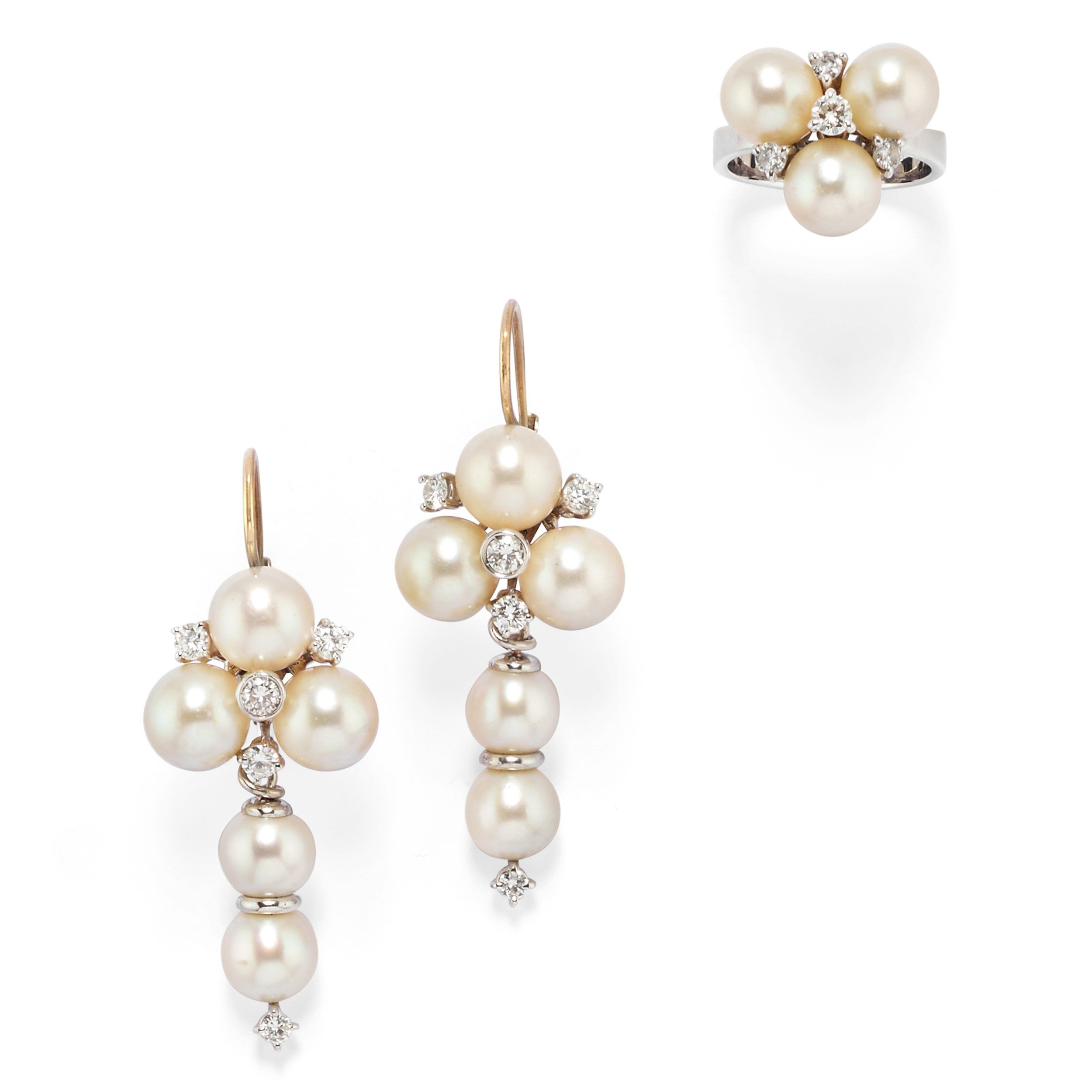 composta da coppia di orecchini con chiusura a monachella e clip e da anello, perle coltivate di mm 8,00/9,00 circa e diamanti taglio brillante per totale ct 1,50 circa.