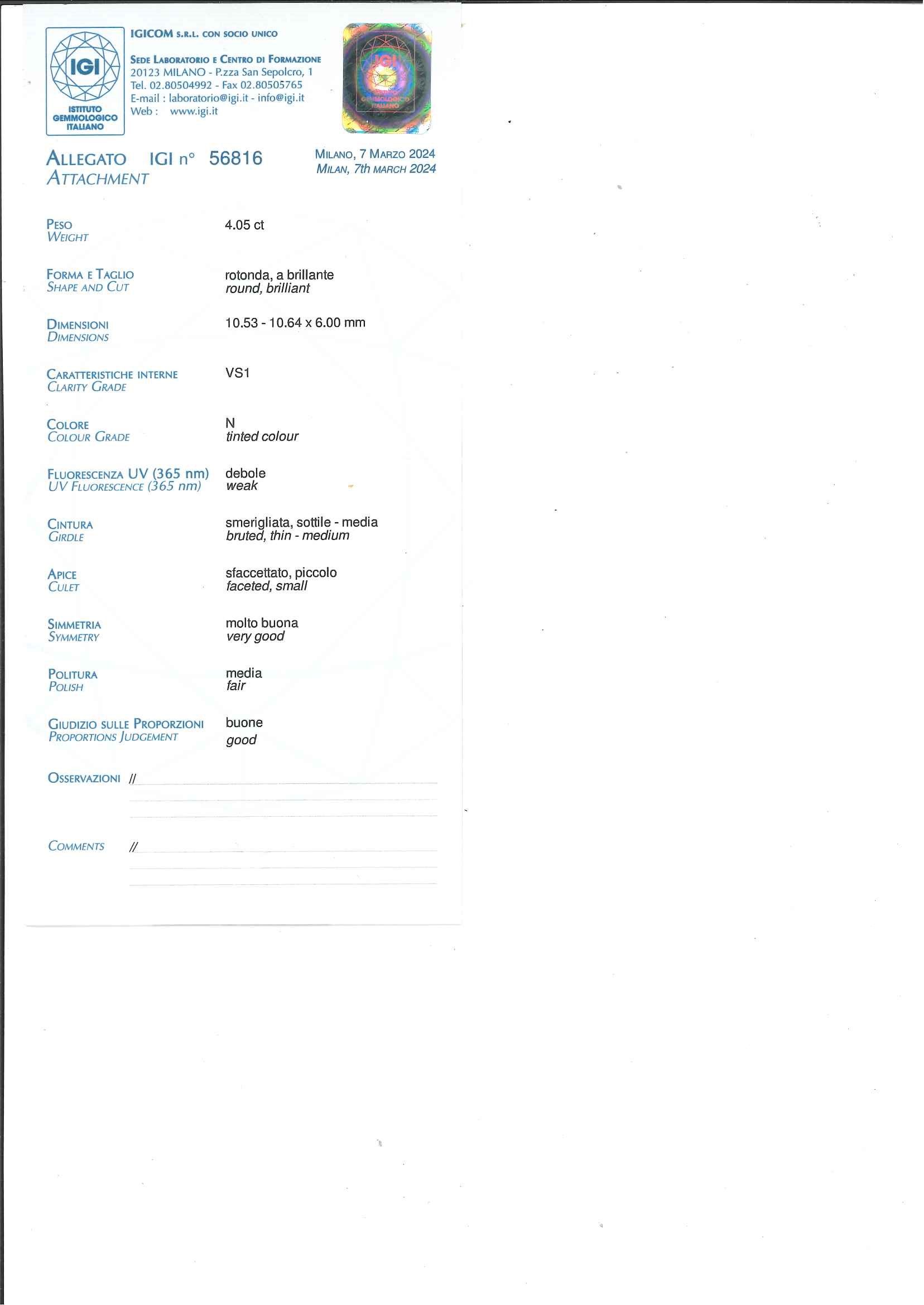 diamante taglio brillante di ct 4,05, colore N, purezza VS1, montatura con spallette gradinate impreziosite da diamanti taglio tapered baguette per totale ct 1,00 circa.
