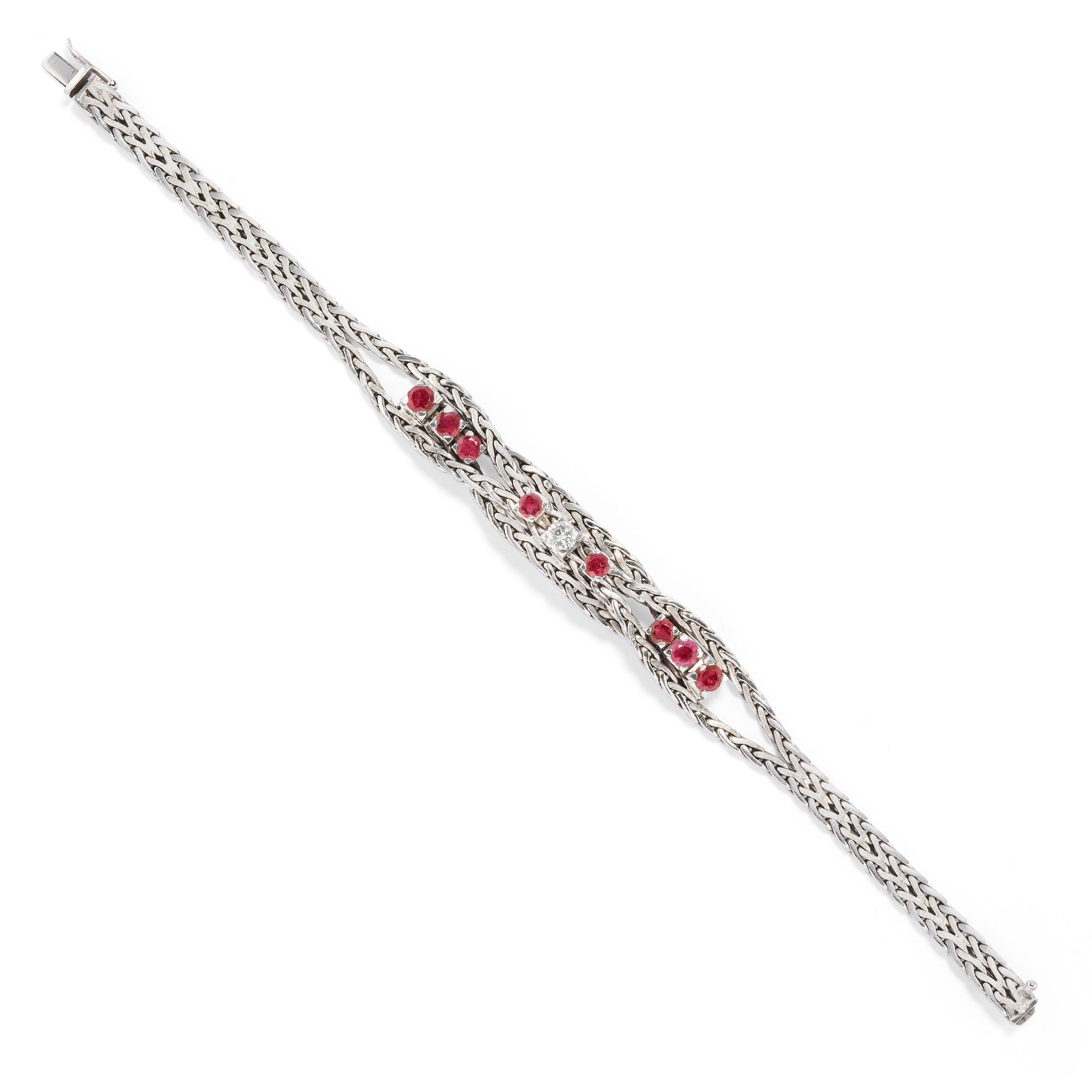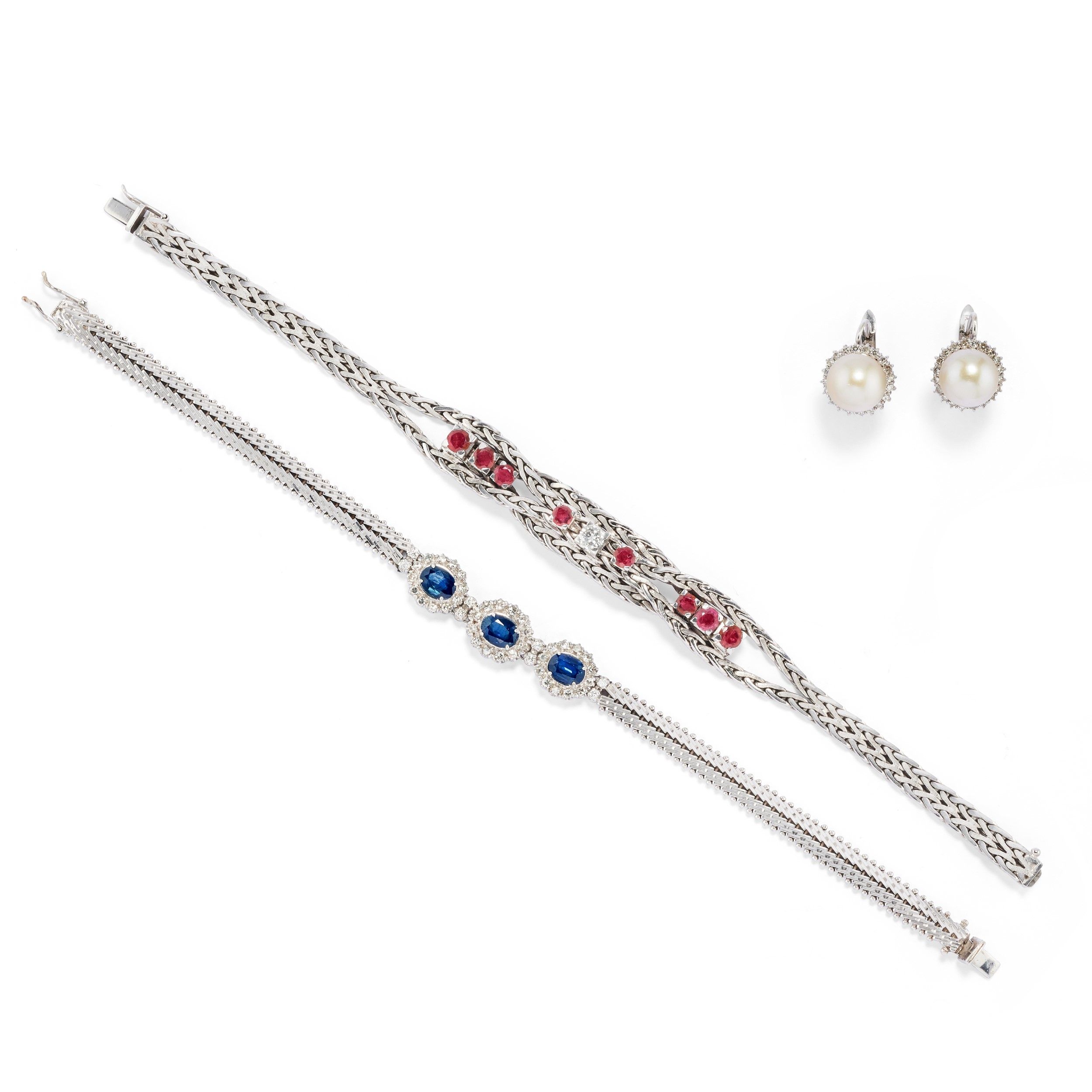 con rubini e zaffiri taglio rotondo e ovale, diamanti taglio brillante e huit-huit e perle coltivate di mm 9,00/9,50 circa, chiusura perno e clip.