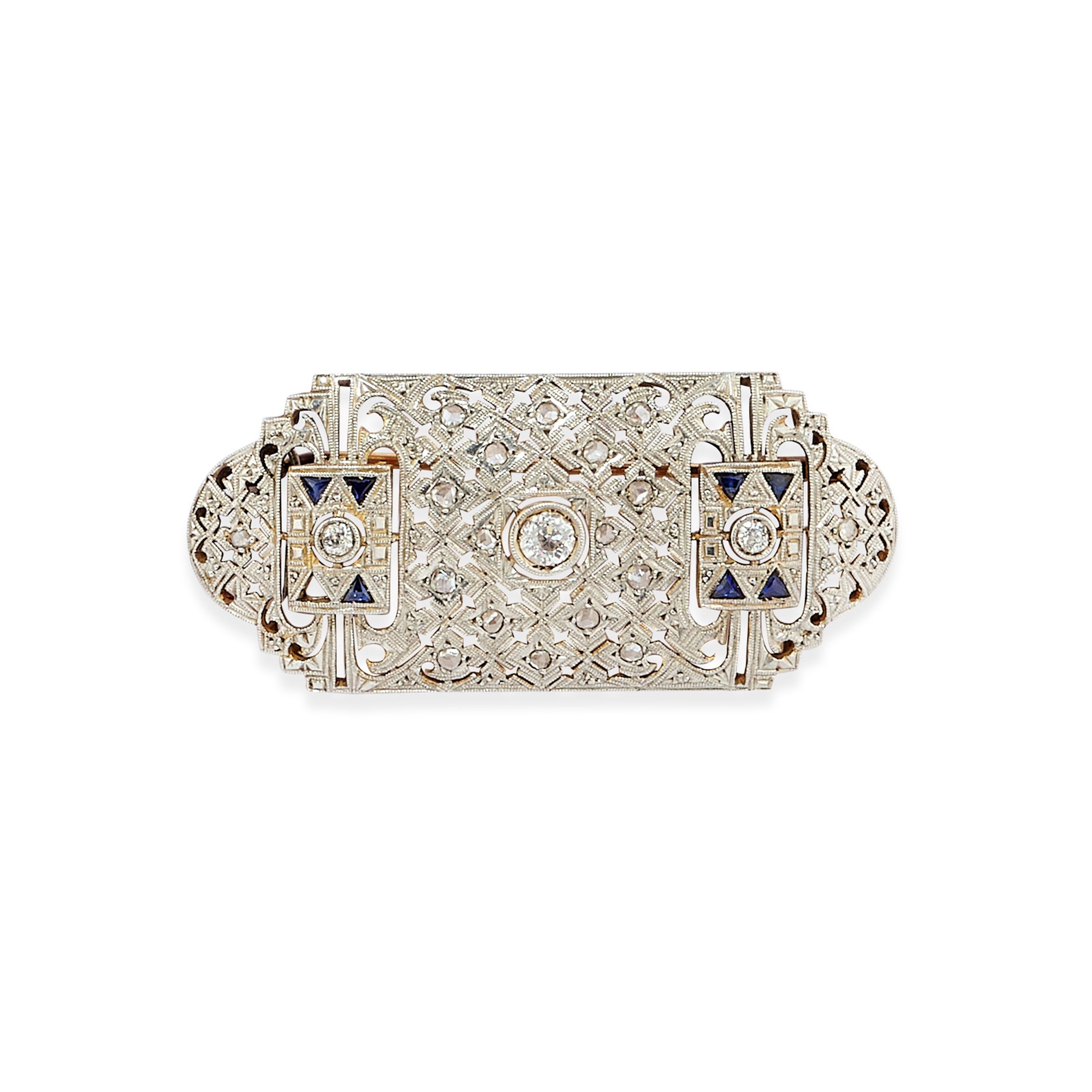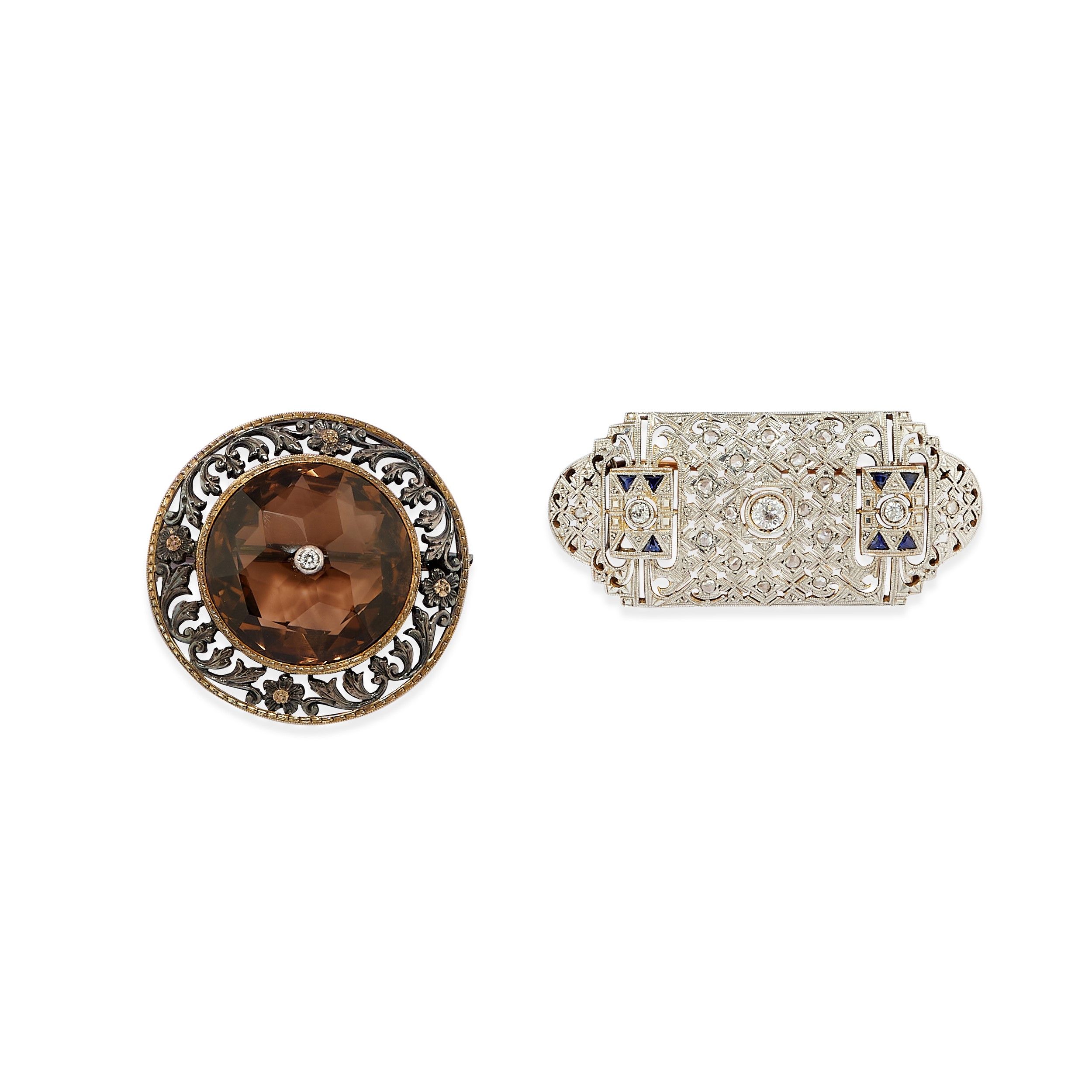 una a saponetta con pietre blu taglio triangolare, tre diamanti taglio vecchio per totale ct 0,40 circa e contorno in diamanti taglio rosa, difetti (una pietra blu mancante, chiusura da sistemare), una rotonda con bordo traforato a motivi vegetali, al centro grande topazio impreziosito da piccolo diamante taglio brillante.