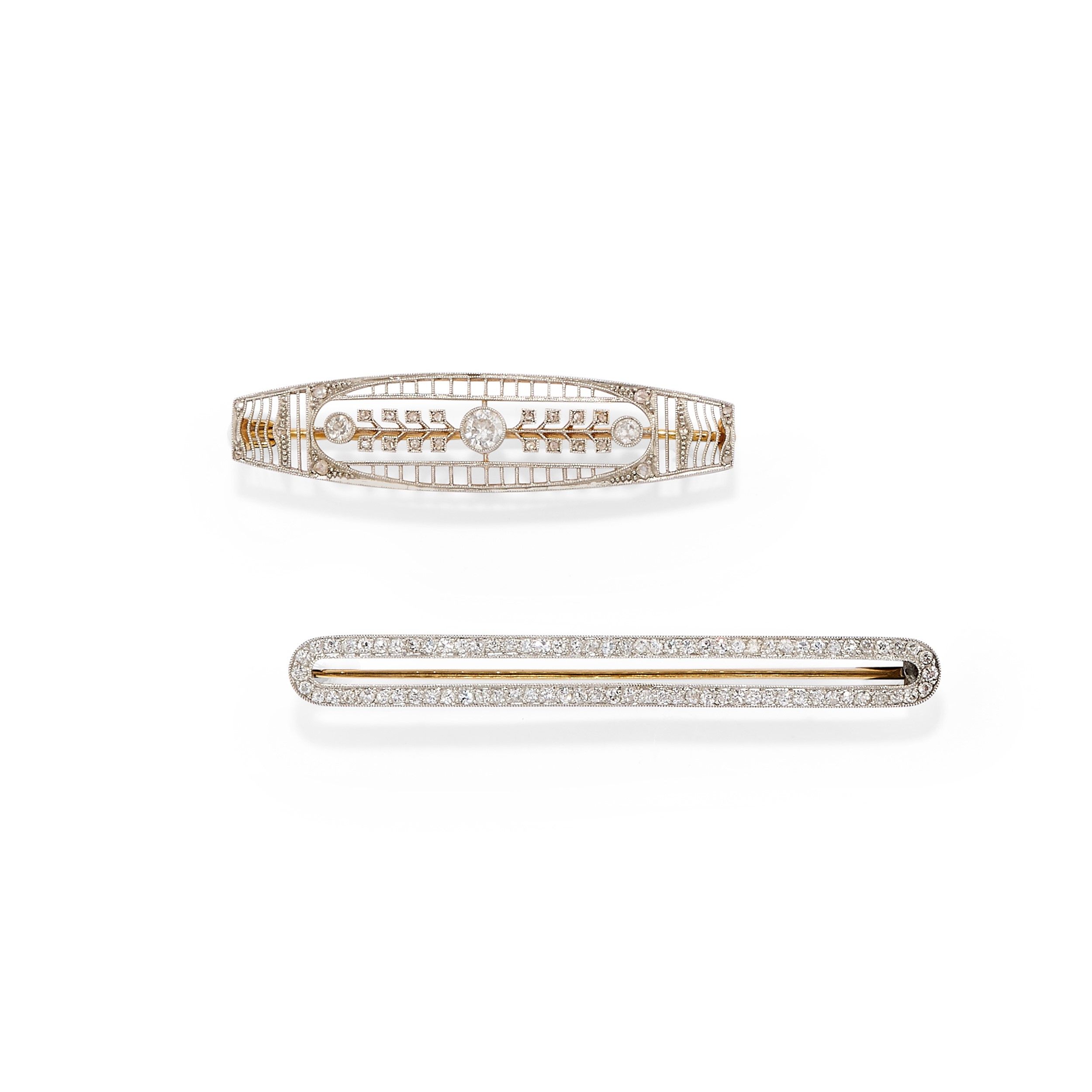 una traforata con diamanti taglio vecchio per totale ct 0,40 circa e piccoli diamanti taglio rosa, una a barretta con diamanti taglio vecchio per totale ct 0,80 circa.