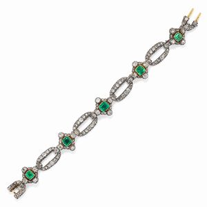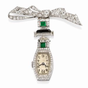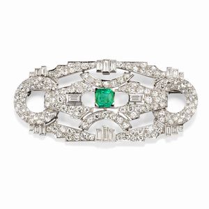 in platino, Peso g 21,80 cm 2,20x7,00 1920 circa di forma allungata, al centro smeraldo taglio quadrangolare [..]