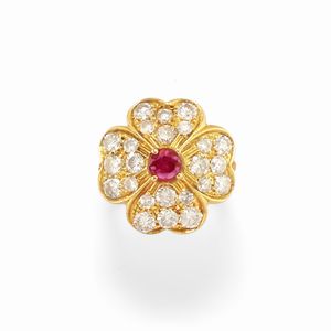 in oro giallo 18k, Peso g 7,30 misura 9 motivo a quadrifoglio, al centro rubino taglio rotondo di ct 0,30 circa [..]