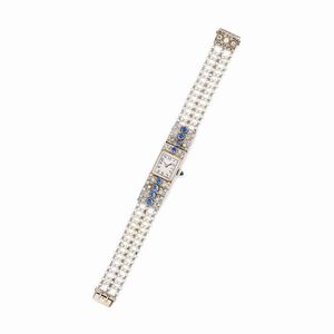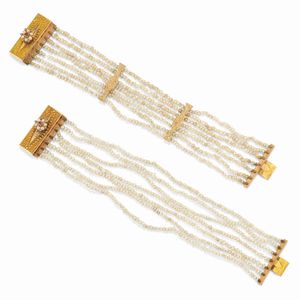 in oro giallo 18k, Peso g 28,50 cm 2,80x16,00 realizzati a sette fili di piccole perle (prob. naturali), decori [..]