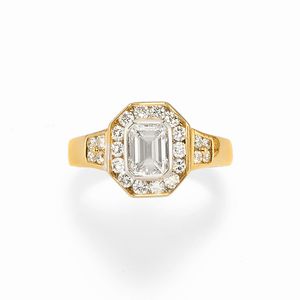 in oro giallo 18k, Peso g 7,25 misura 15 al centro diamante taglio rettangolare a contorno ottagonale di ct 0,70 [..]