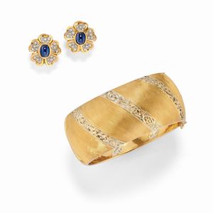 in oro giallo 18k, Peso g 24,20 diametro interno cm 5,90 a schiava con al centro decoro in zaffiri gialli e blu [..]
