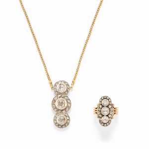 in oro giallo 18k e argento, Peso g 23,00 misura 12 cm 1,70x4,20-40,00 composta da collana e anello con settori [..]