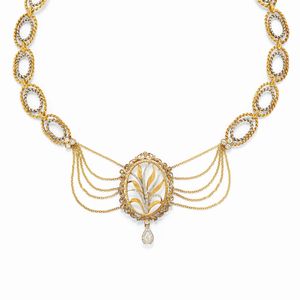 in oro bicolore 18k e argento, Peso g 54,30 cm 44,00 maglia a ovali in cordone ritorto, al centro motivo floreale [..]