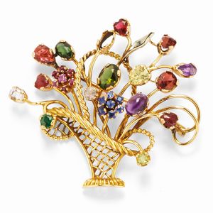 in oro giallo 18k, Peso g 13,00 cm 5,00x4,30 realizzato a cestino fiorito, con pietre di colore di varie forme [..]