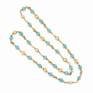 in oro giallo 18k, Peso g 74,90 cm 88,00 ad un filo di boules di pietre azzurre e rosa alternate a sfere in oro [..]
