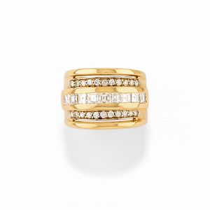 in oro giallo 18k, Peso g 7,40 misura 15 realizzato a contrarič, con diamanti taglio goccia, brillante e tapered [..]
