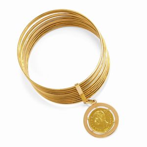 in oro giallo 18k e oro alto titolo, Peso g 81,00 diametro interno cm 6,80 composto da dieci cerchi rigidi con [..]