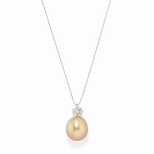 in platino, Peso g 5,60 misura 16 al centro una perla naturale semi barocca di acqua salata di ct 11,00 circa, [..]