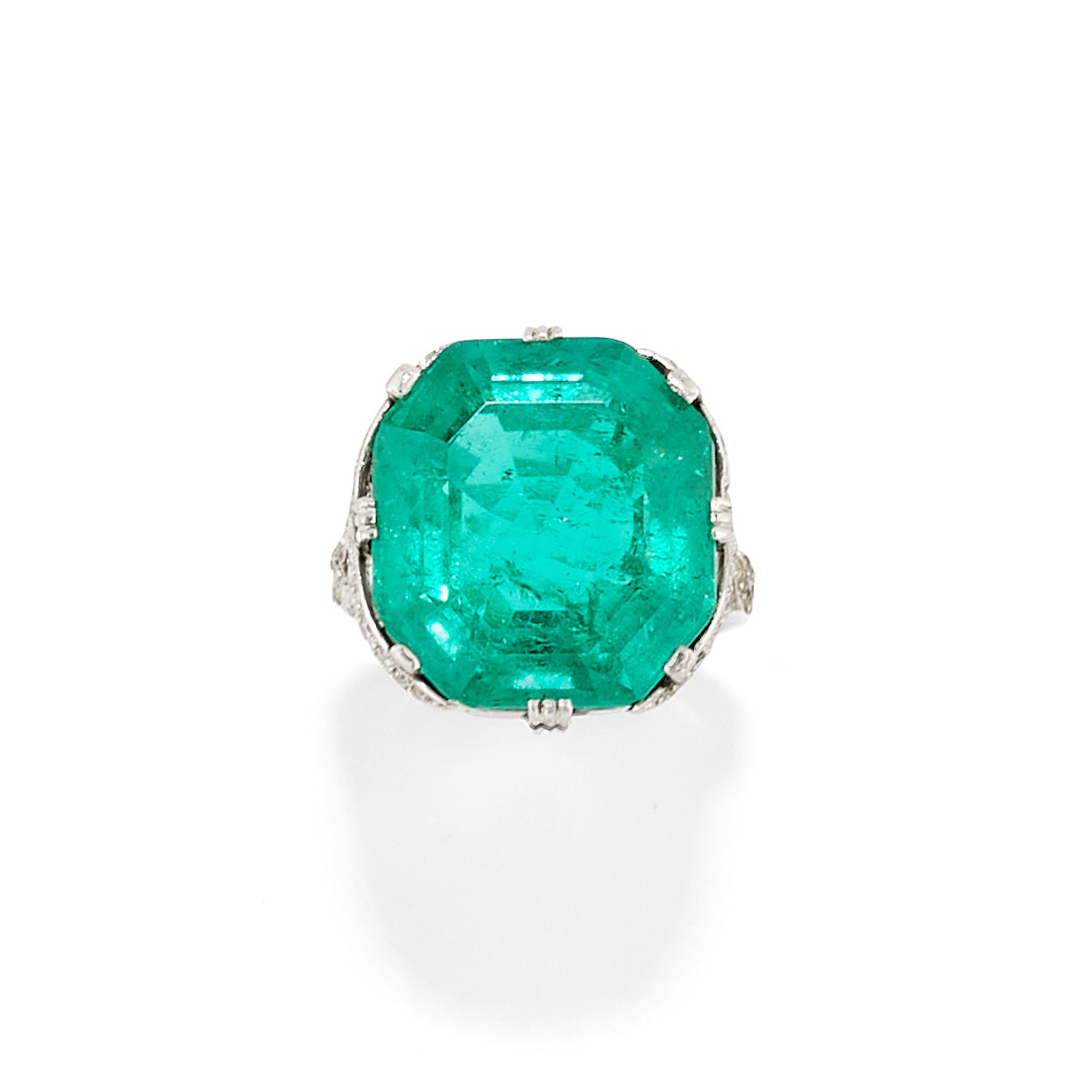 al centro smeraldo Colombia taglio ottagonale a gradini di ct 17,50 circa, ai lati diamanti taglio rosa e huit-huit per totale ct 0,50 circa, montatura tagliata, difetti (un piccolo diamante mancante).