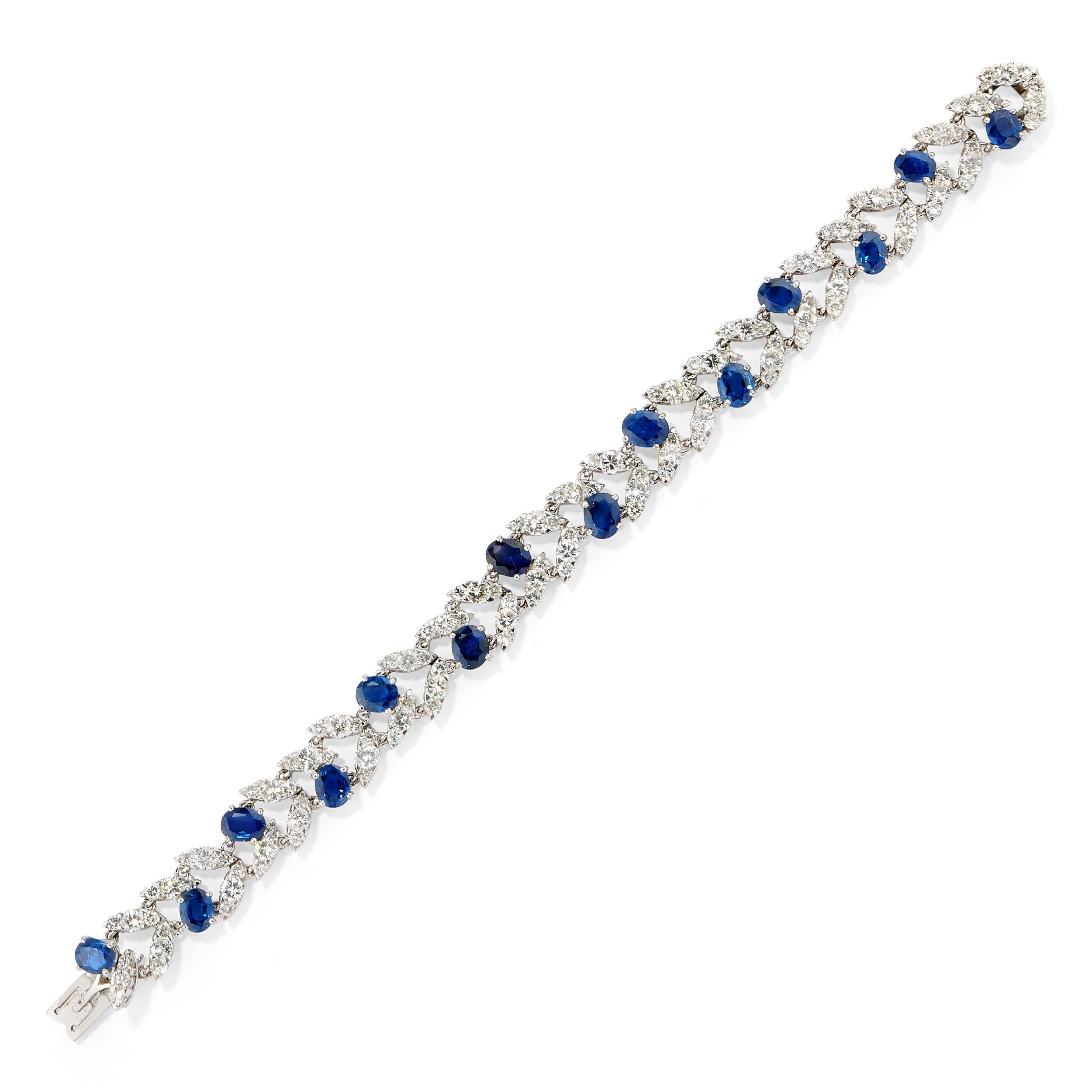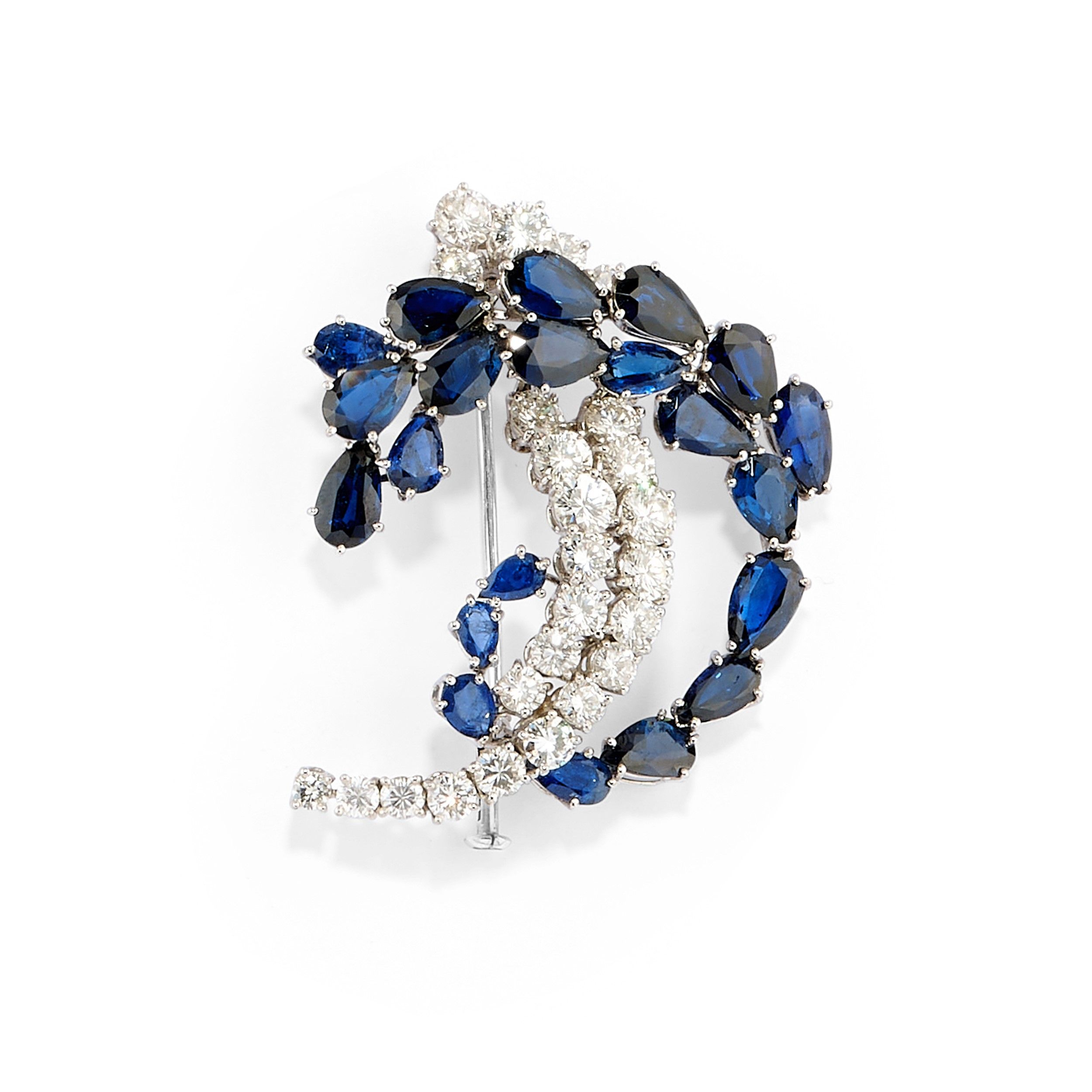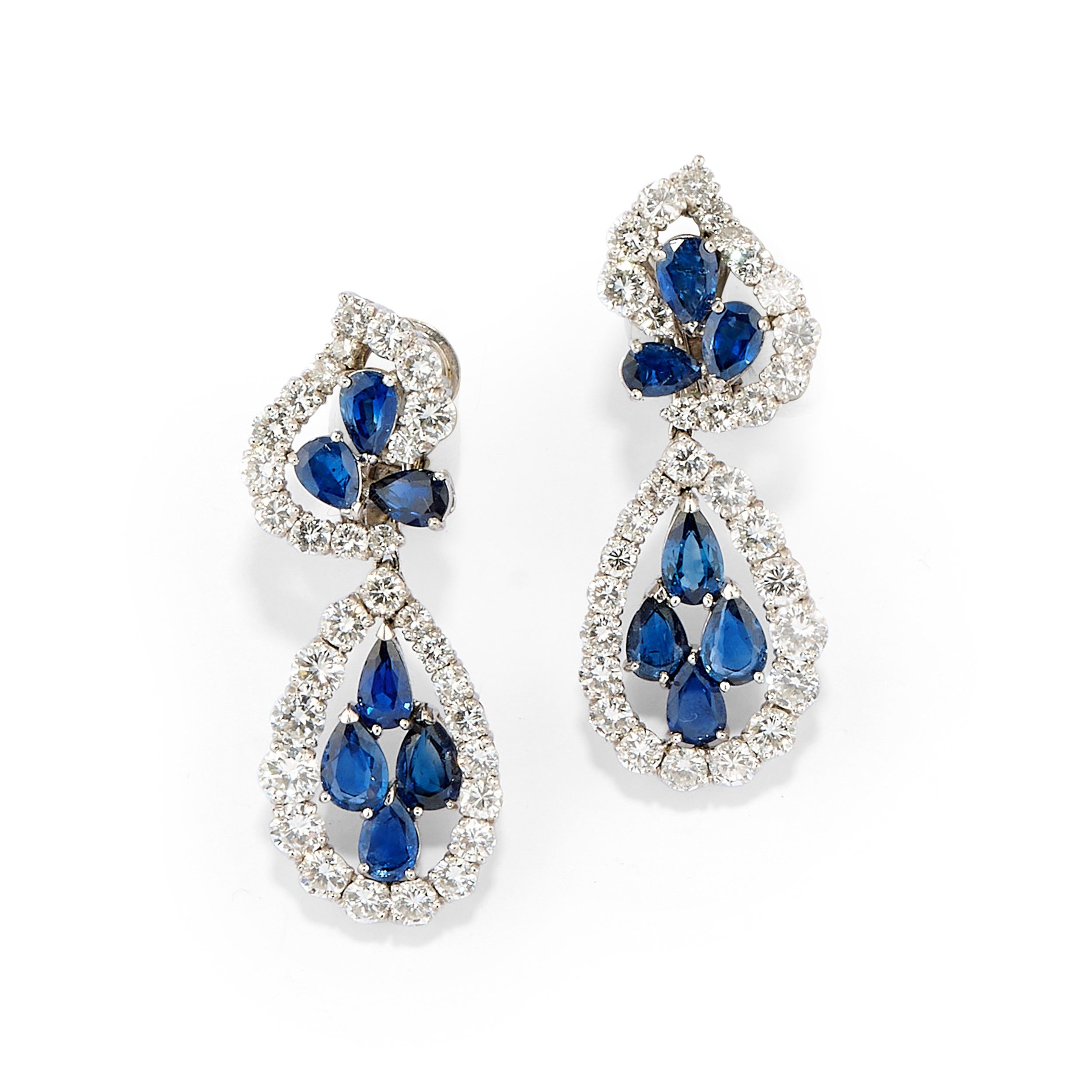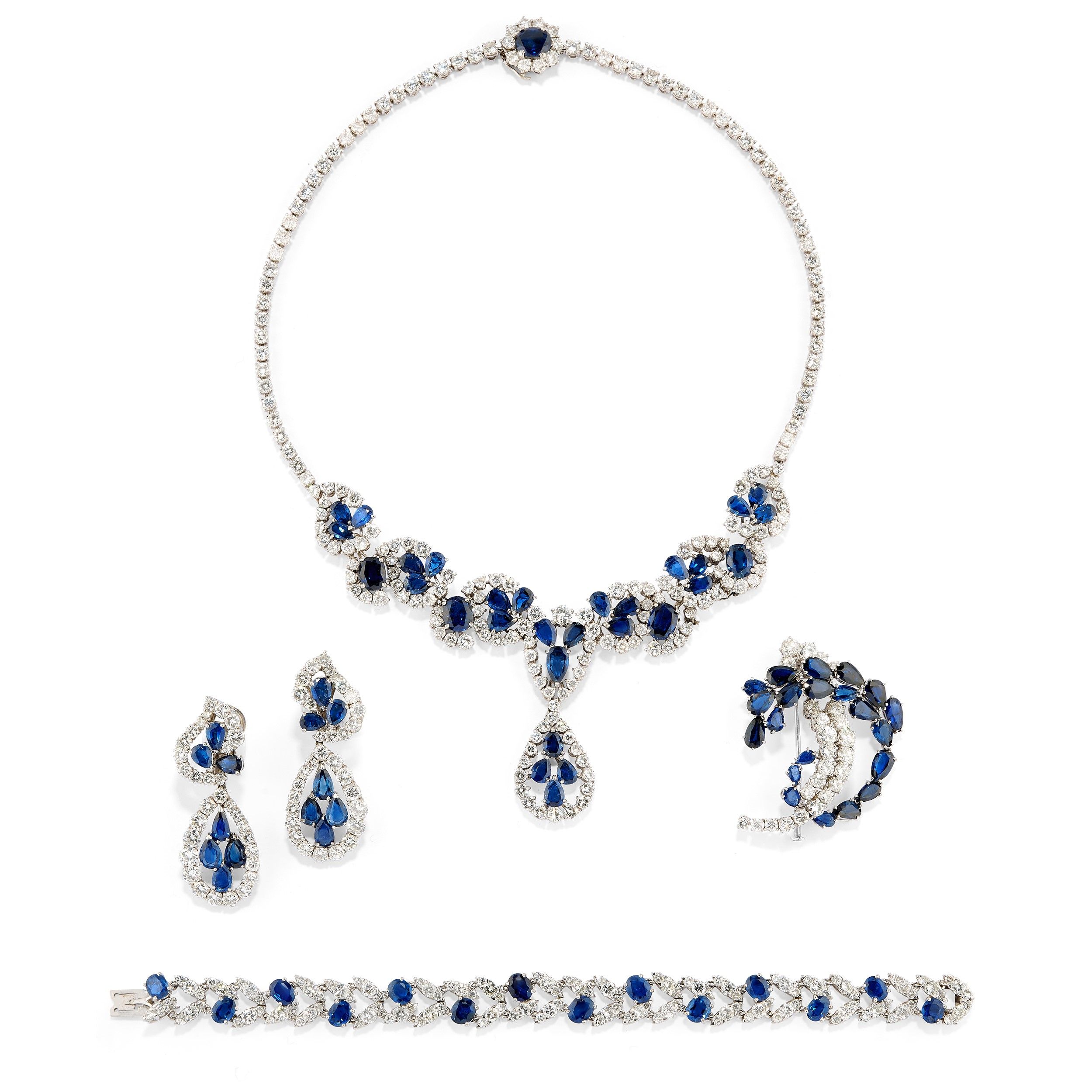interamente in diamanti taglio brillante per totale ct 40,00 circa e zaffiri taglio ovale e goccia per totale ct 50,00 circa, composta da collana, spilla e coppia di orecchini pendenti con chiusura a clip.