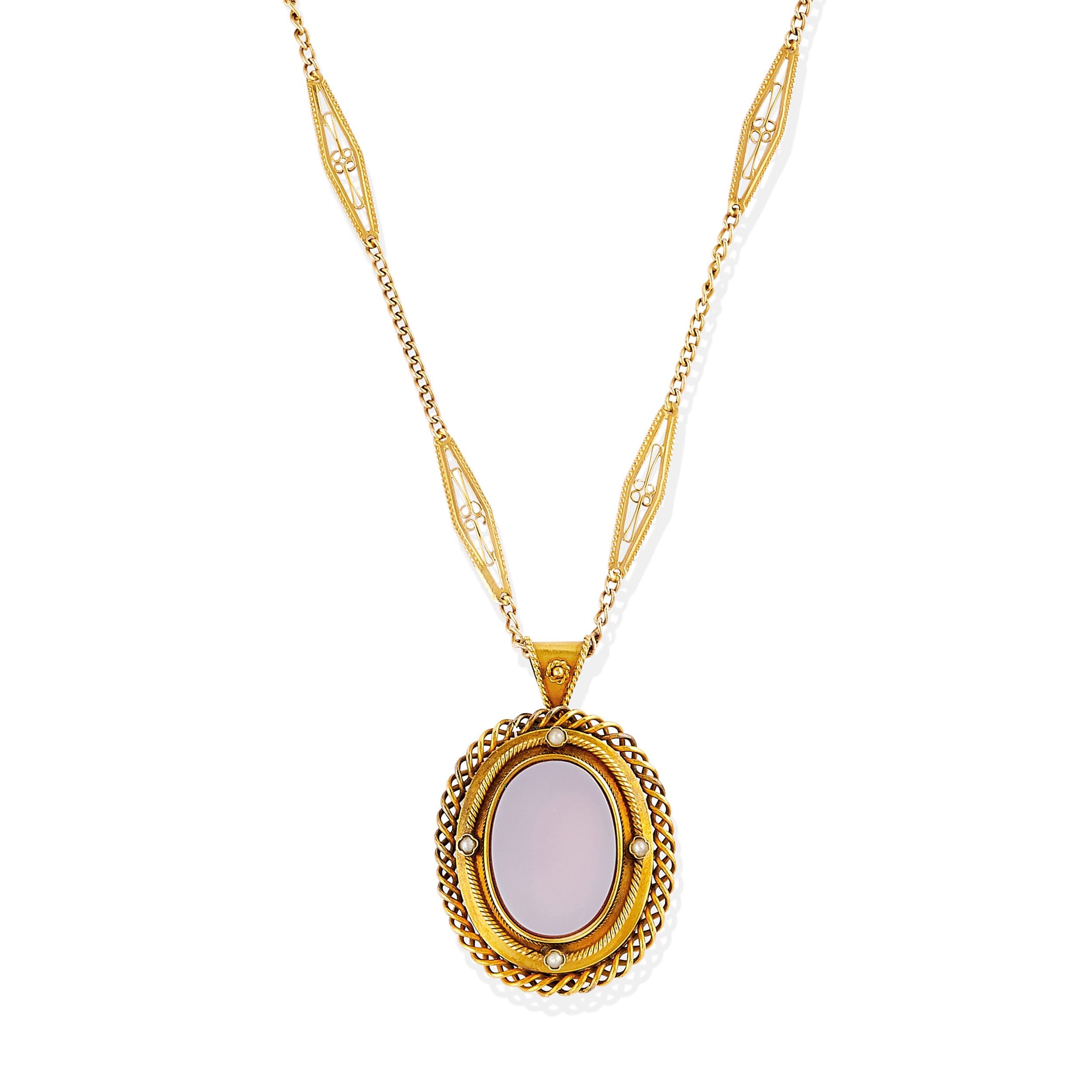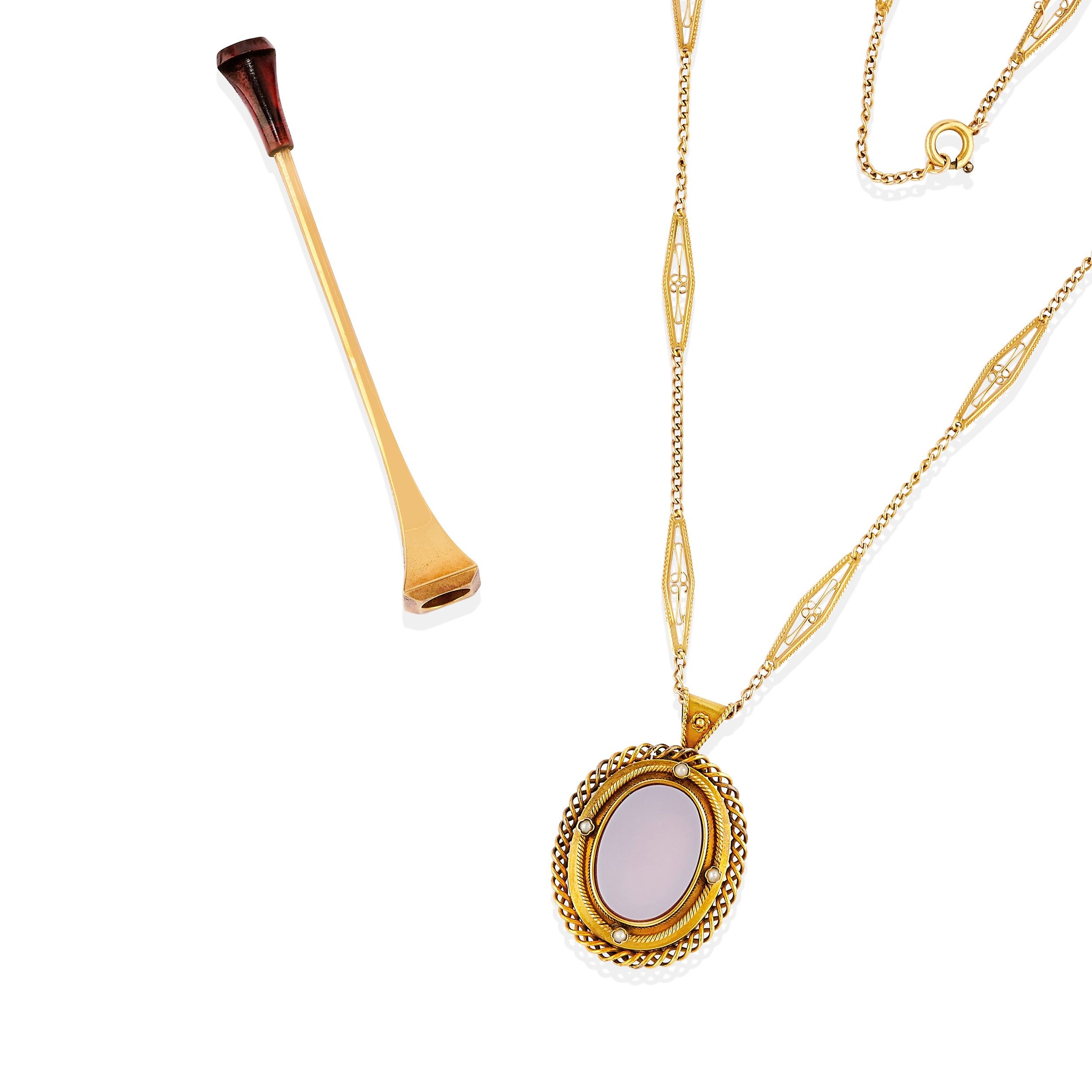 composto da collana con pendente decorato al centro da pietra dura e microperle e da bocchino in oro 18k con custodia, difetti (mancanza al retro del pendente).