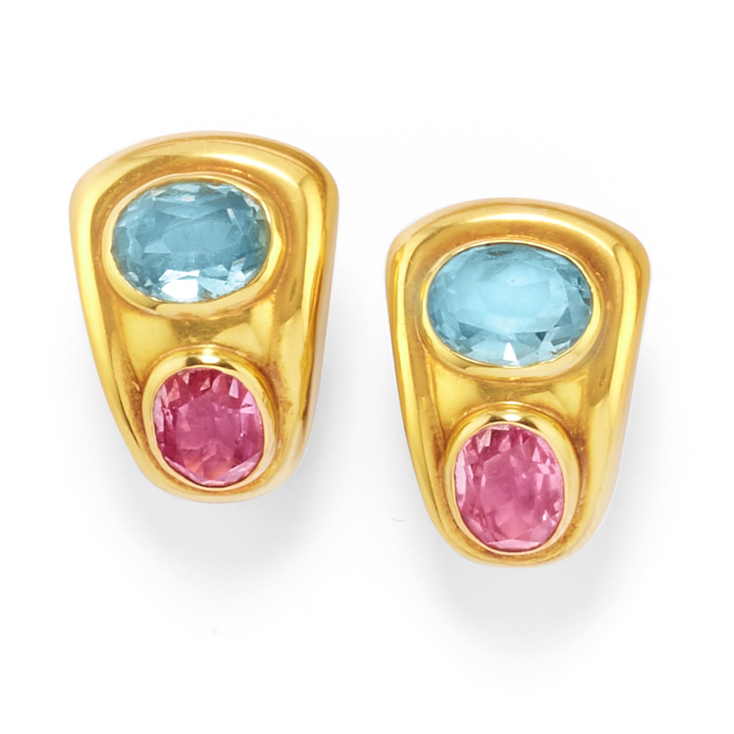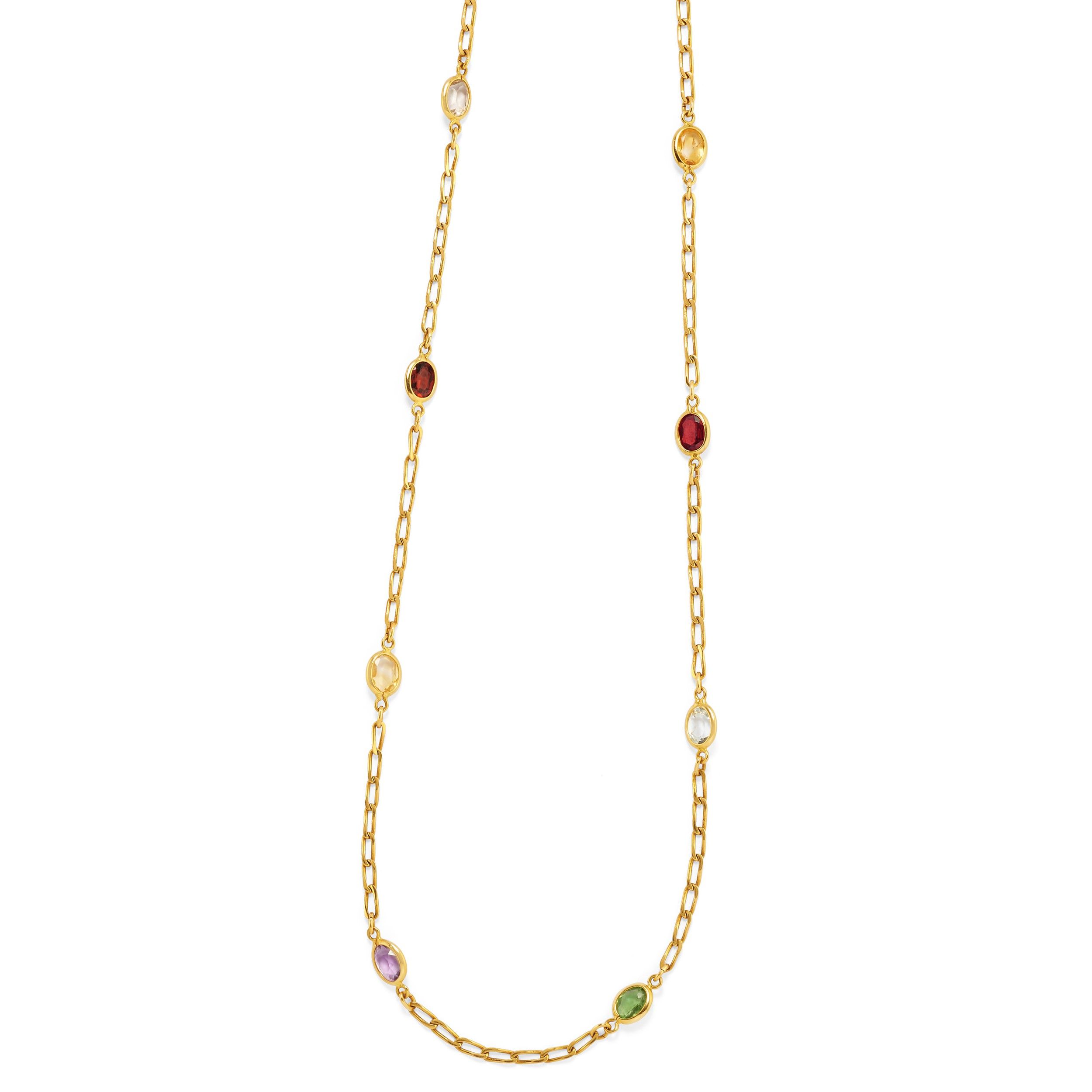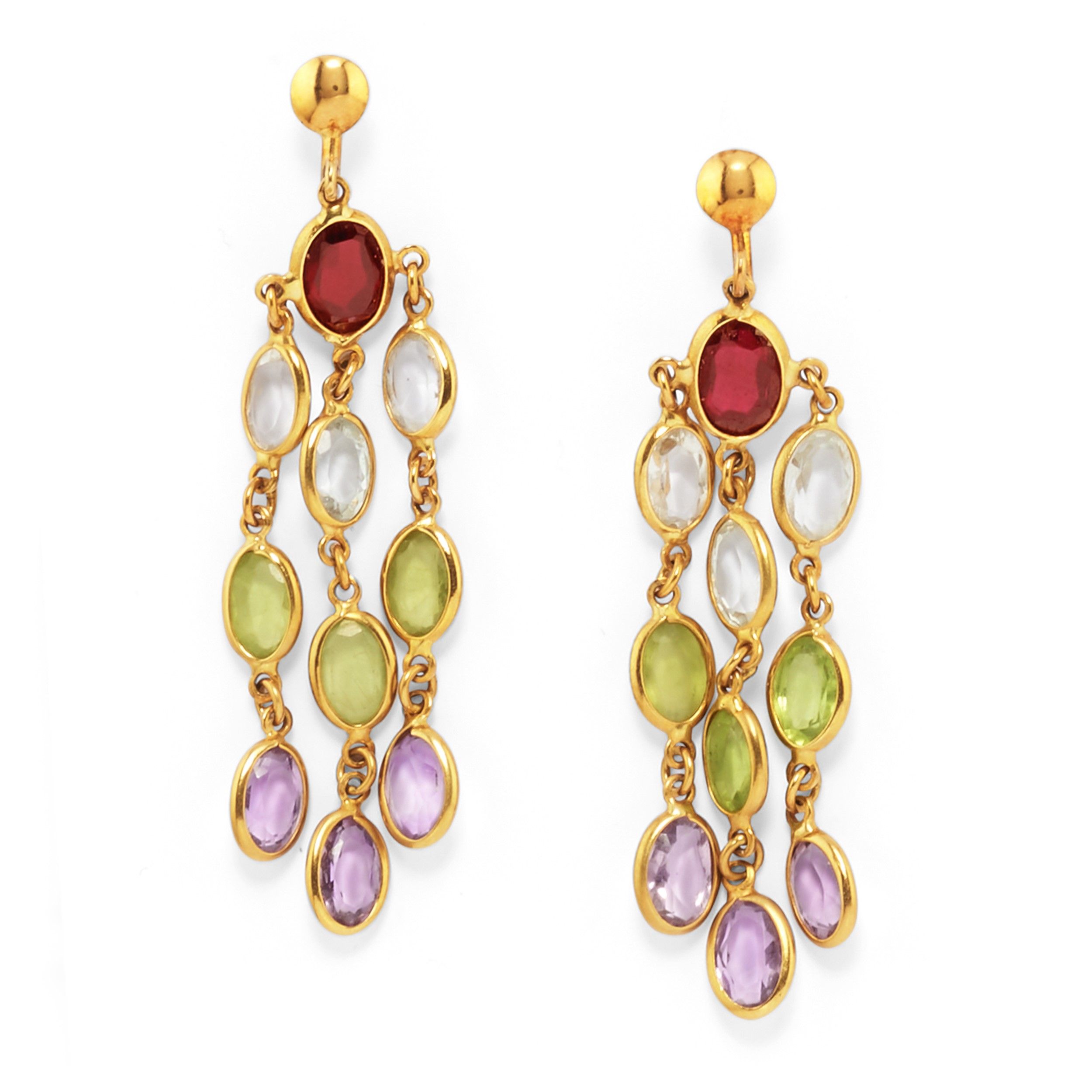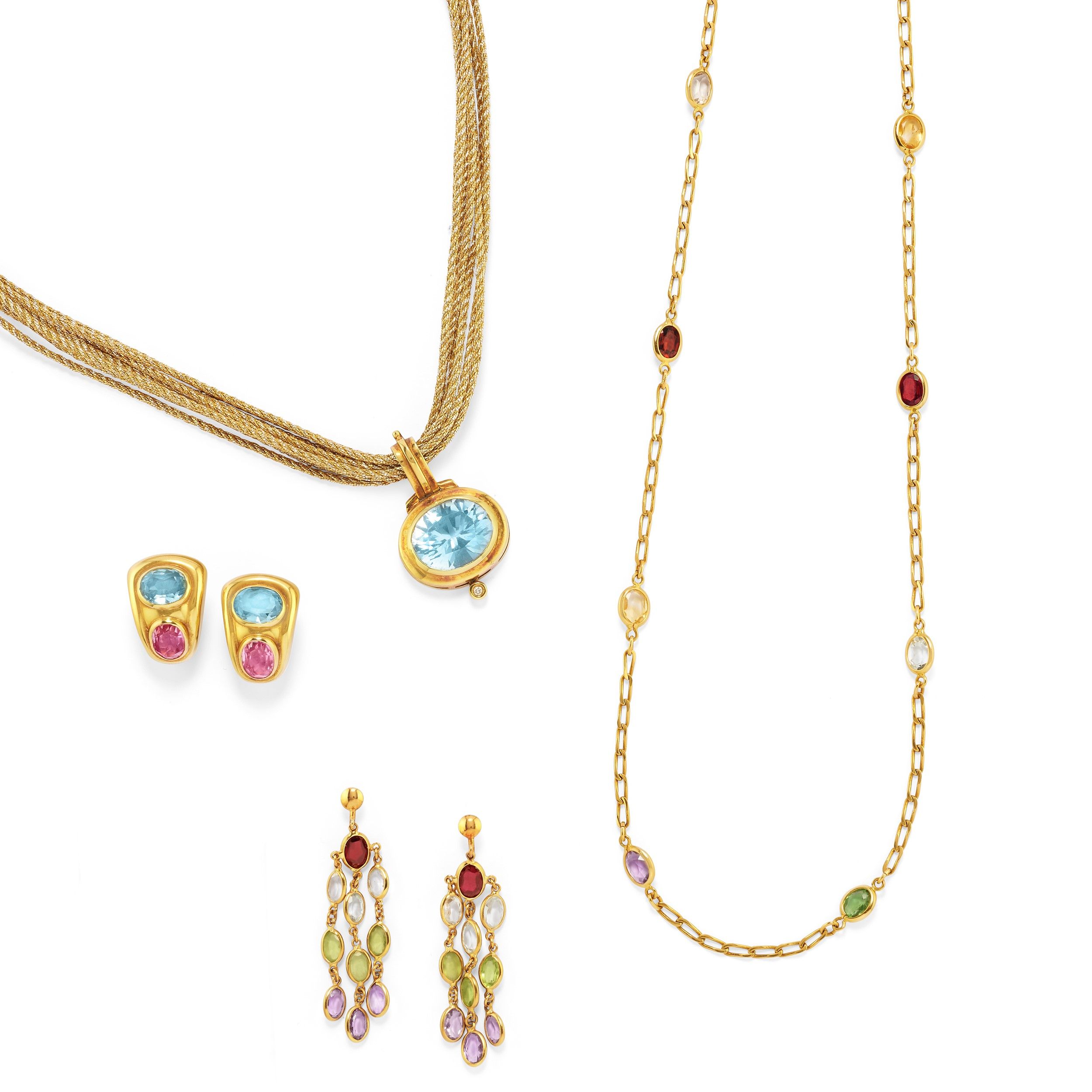 composto da due collane e due coppie di orecchini con chiusure a clip, perno e farfalla, pietre di colore di varie forme e tagli.