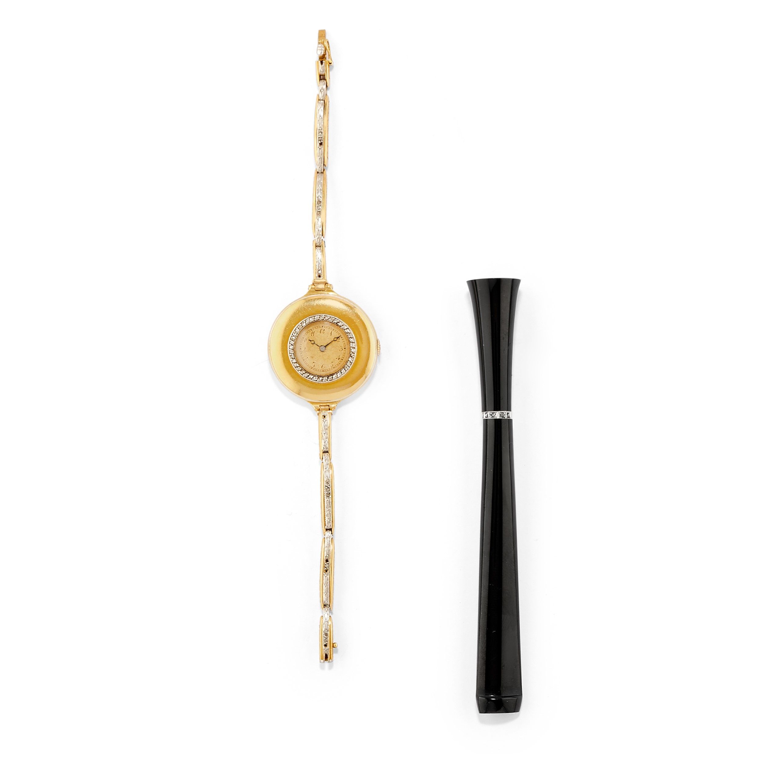 in oro giallo 18k, argento e platino, Peso g 33,20 cm 10,10-14,20 prima metà XX secolo composto da bocchino in onice decorato da piccoli diamanti taglio rosa, con astuccio e orologio con cassa rotonda, quadrante champagne con numeri arabi in smalto nero e decoro in smalto e piccoli diamanti taglio rosa, difetti (alcuni diamanti mancanti).