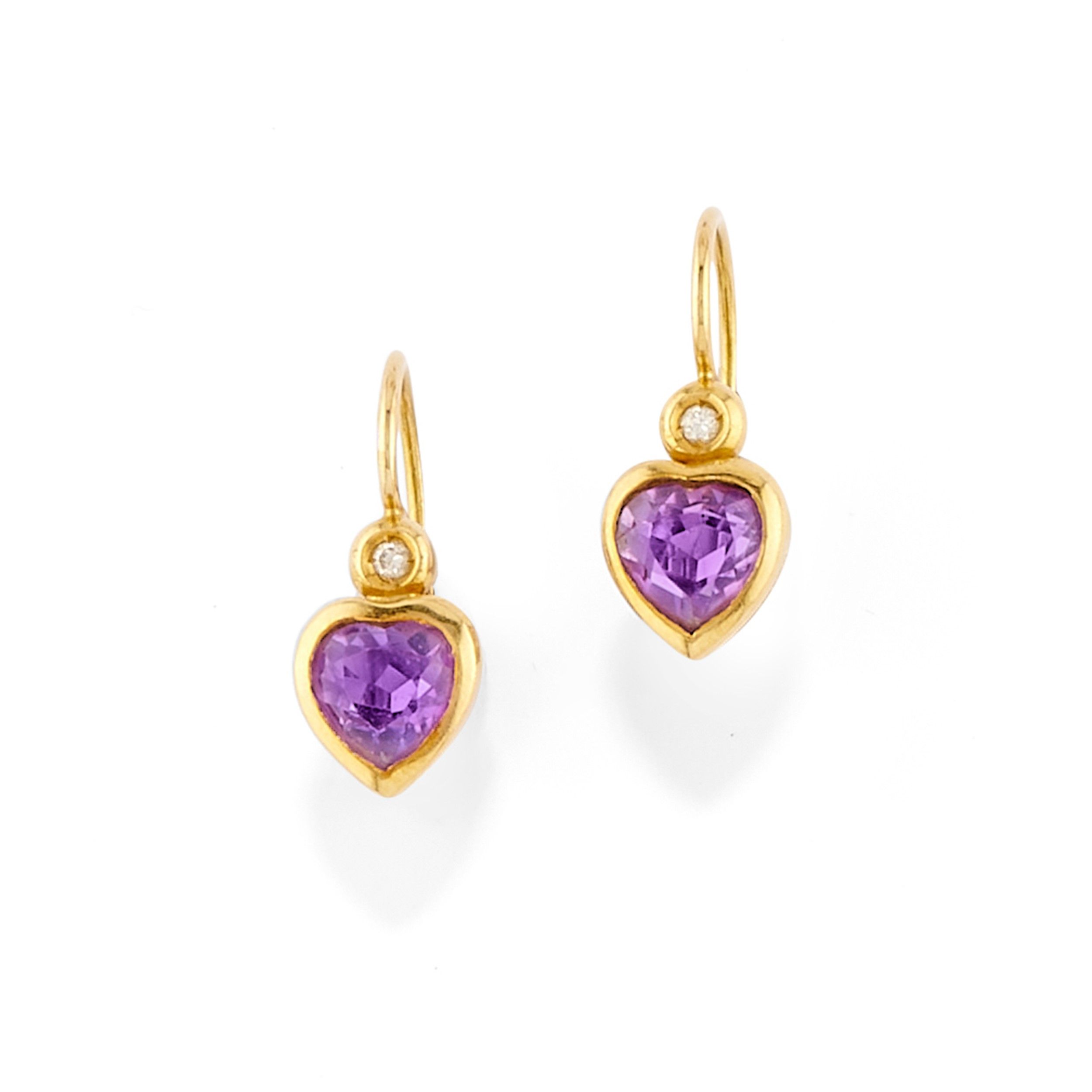 con ametiste taglio cuore e due piccoli diamanti taglio brillante, chiusura a monachella e clip.