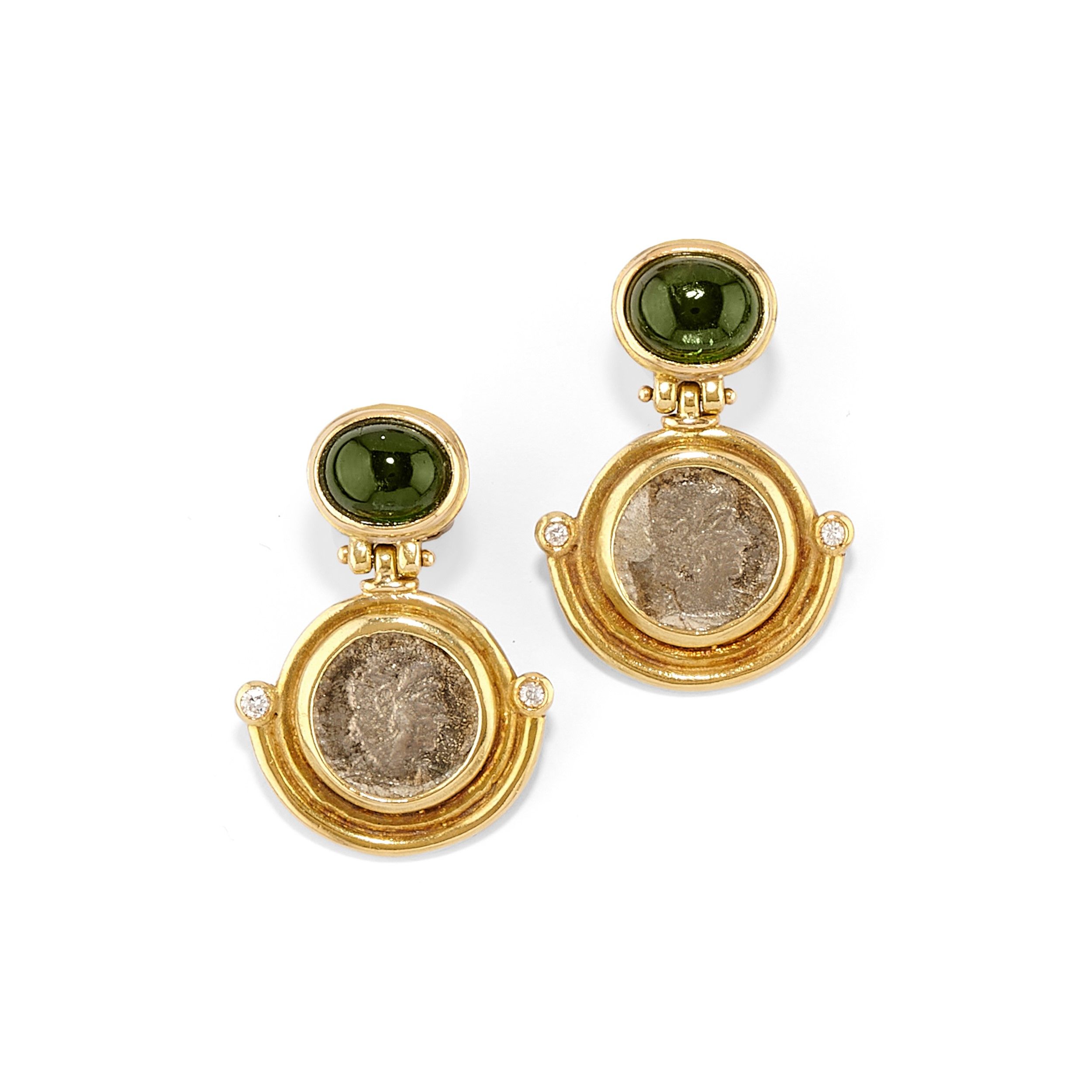 parte superiore con tormaline verdi e motivo oscillante con moneta antica, ai lati diamanti taglio brillante ed una pietra incolore ad imitazione del diamante.