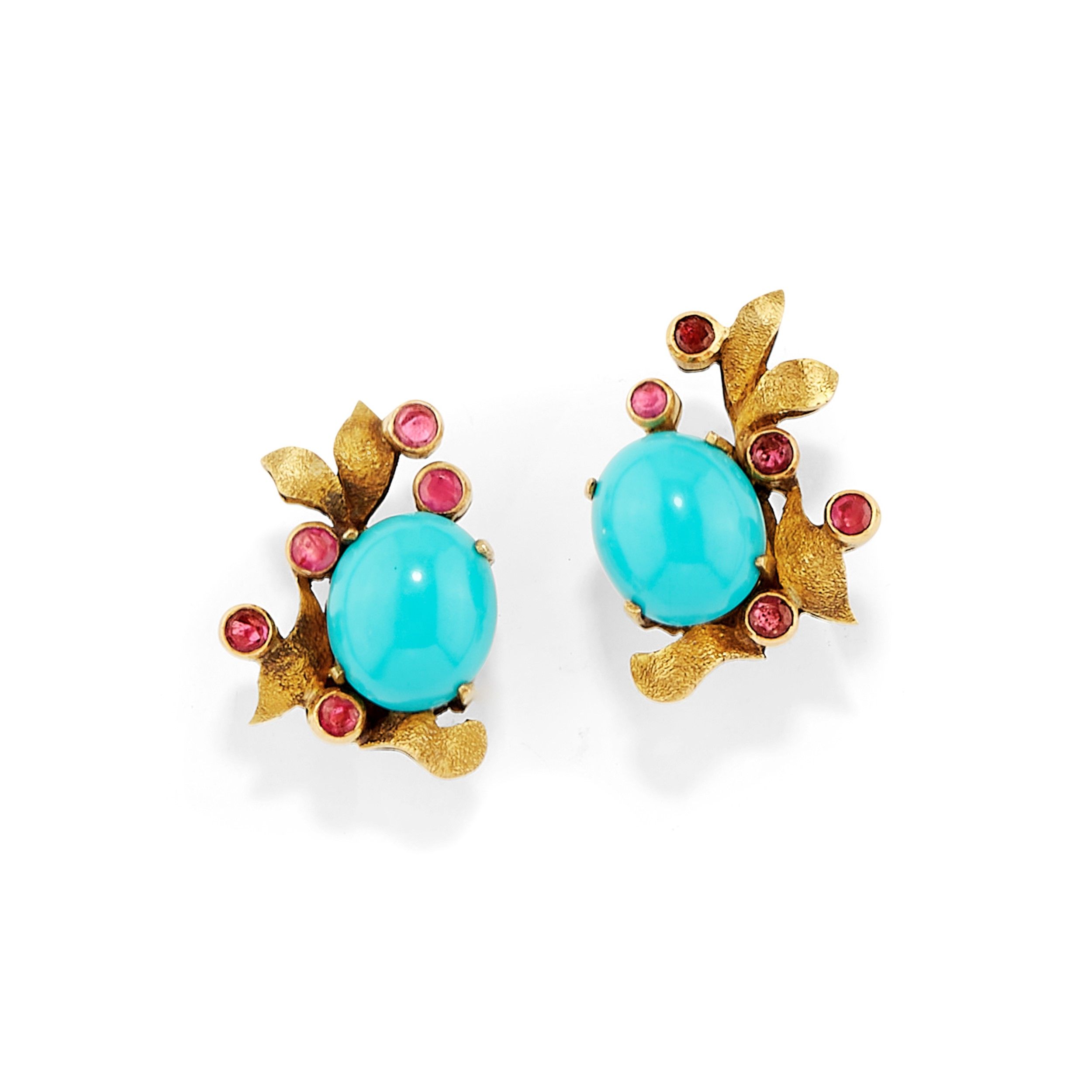 decoro fogliaceo con al centro pasta di turchese taglio ovale cabochon e contorno in rubini taglio rotondo, chiusura perno e vite.