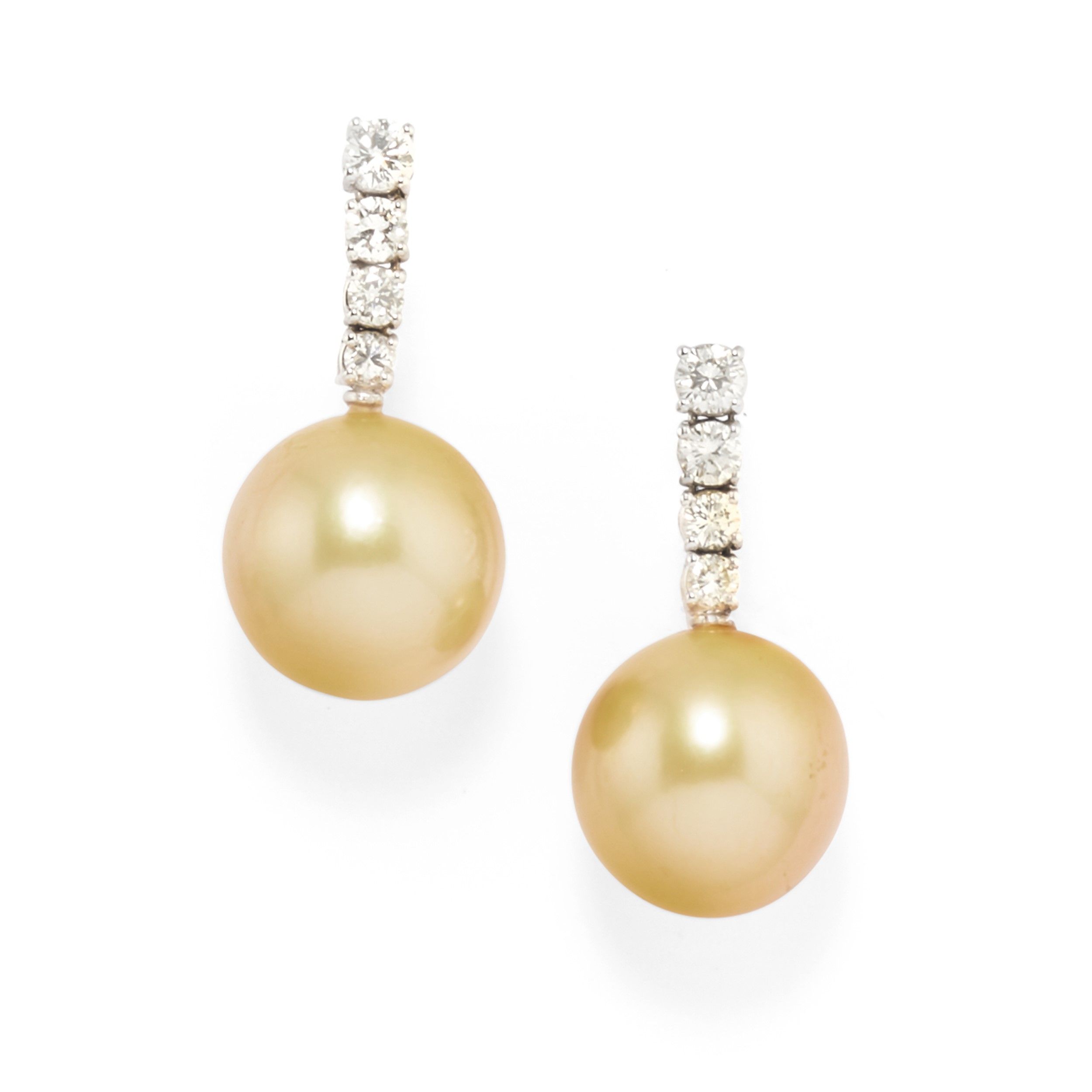 parte superiore con diamanti taglio brillante per totale ct 1,10, perla coltivata South Sea golden di mm 14,00 circa, chiusura perno e farfalla.