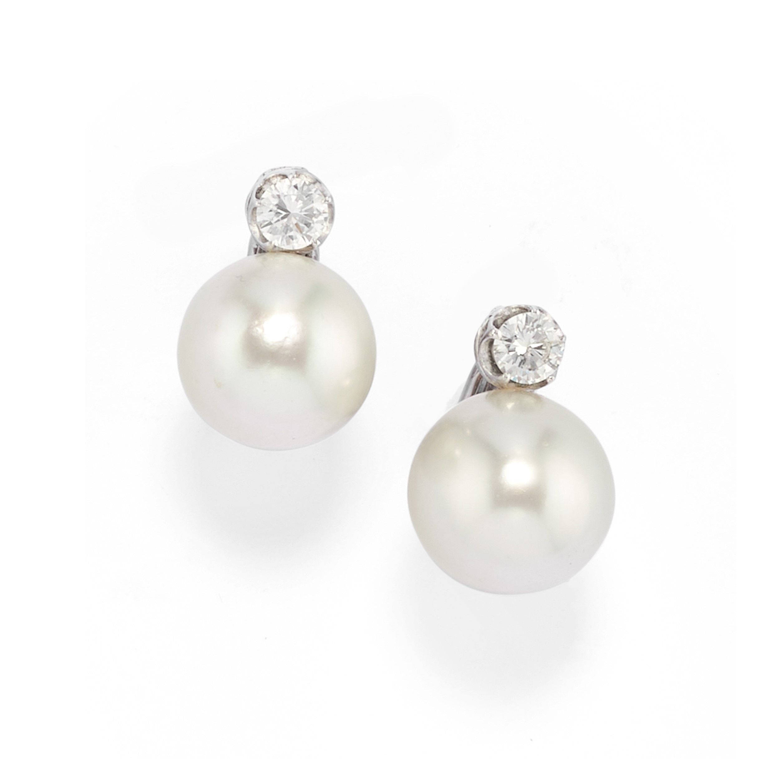 diamanti taglio brillante per totale ct 1,00 circa e perle coltivate South Sea di mm 12,30/13,00, chiusura perno e clip.