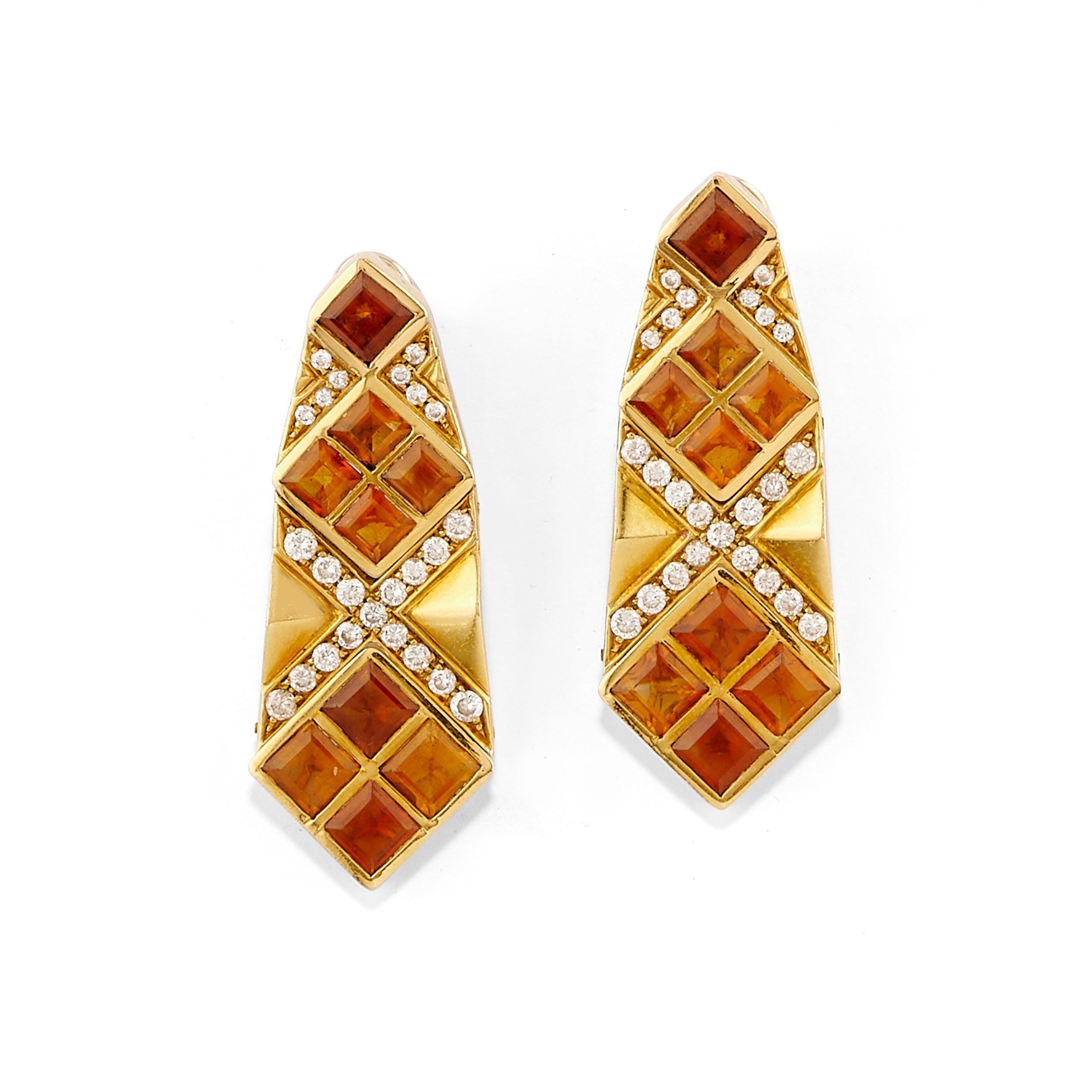 motivo a rombi in quarzi arancioni taglio carré e decoro in diamanti taglio brillante per totale ct 0,80 circa.