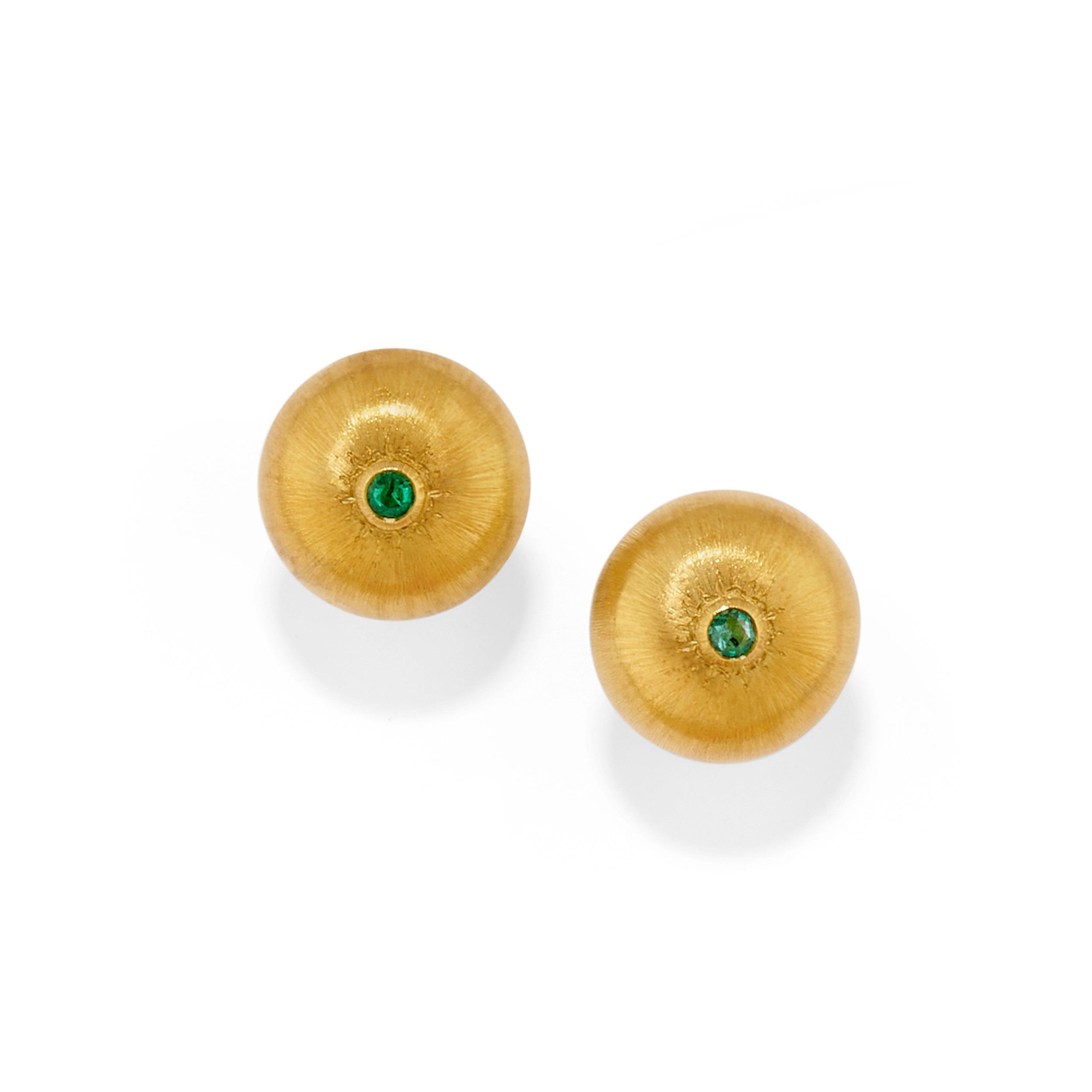 rotondi, bombati e satinati con al centro smeraldi taglio rotondo, chiusura perno e clip.