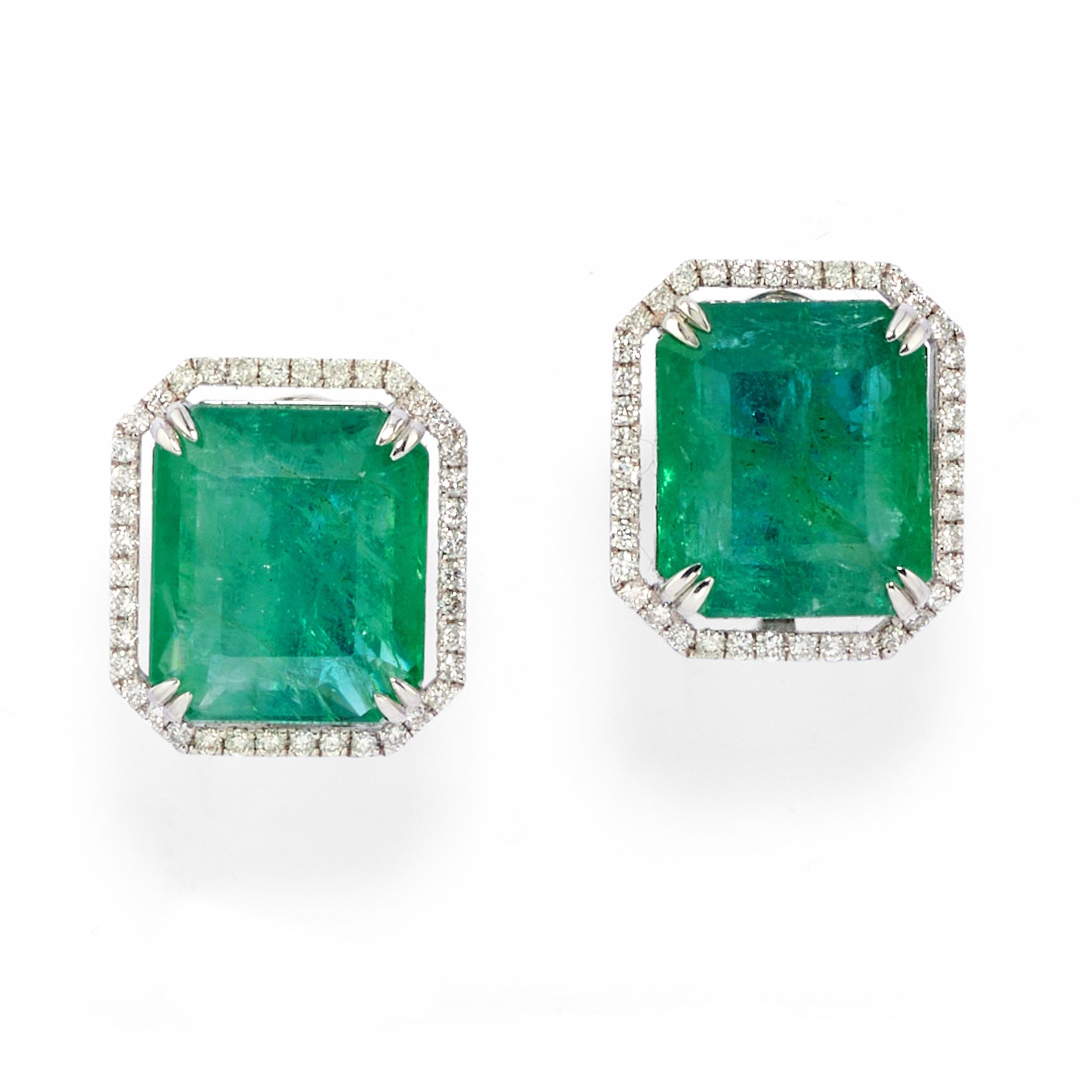 al centro smeraldi taglio rettangolare a contorno ottagonale per totale ct 20,15 (caratura incisa) e diamanti taglio brillante per totale ct 0,73 (caratura incisa), chiusura perno e clip.