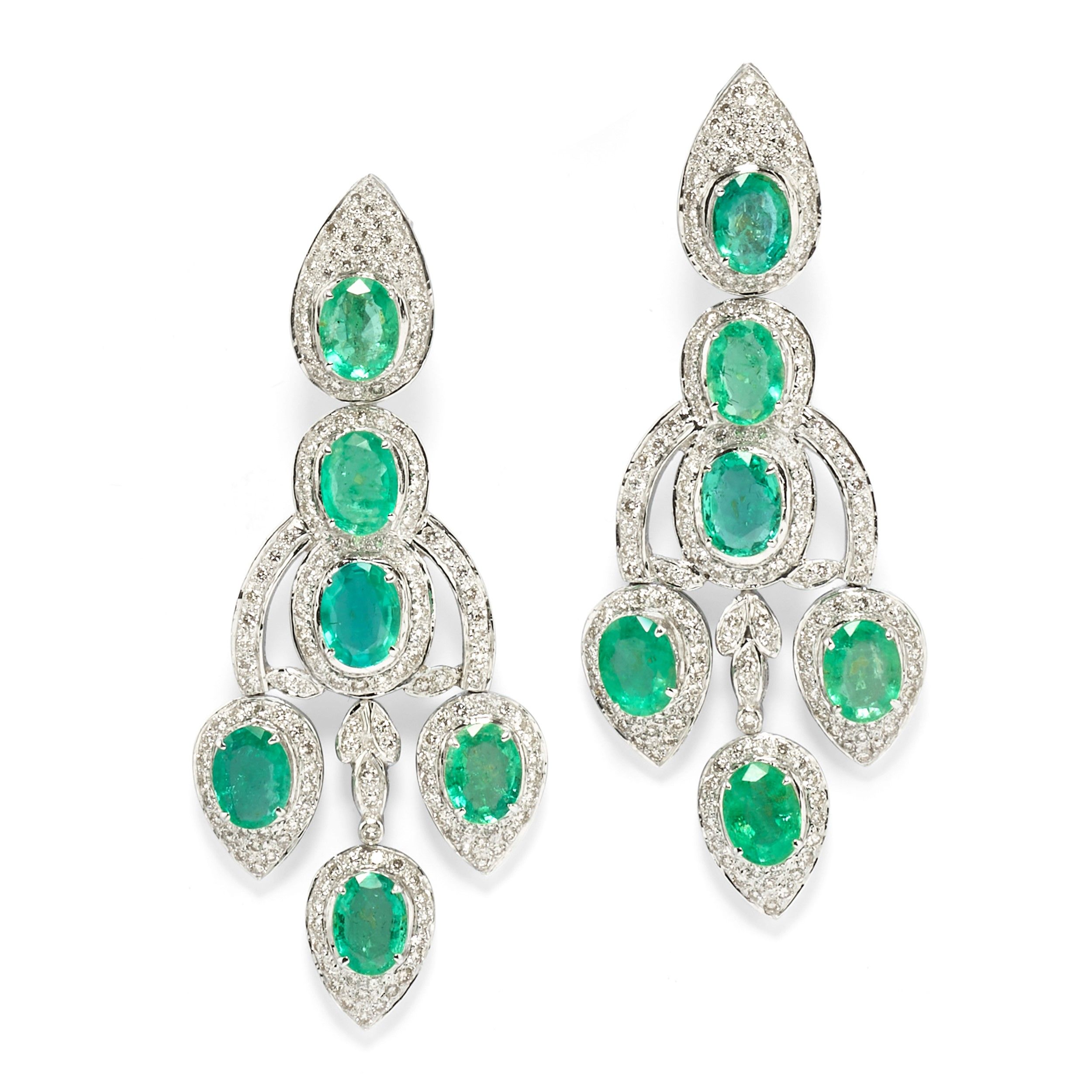 realizzati con motivo a goccia, smeraldi taglio ovale per totale ct 9,00 circa e diamanti taglio brillante per totale ct 3,00 circa, chiusura perno ripieghevole e clip.