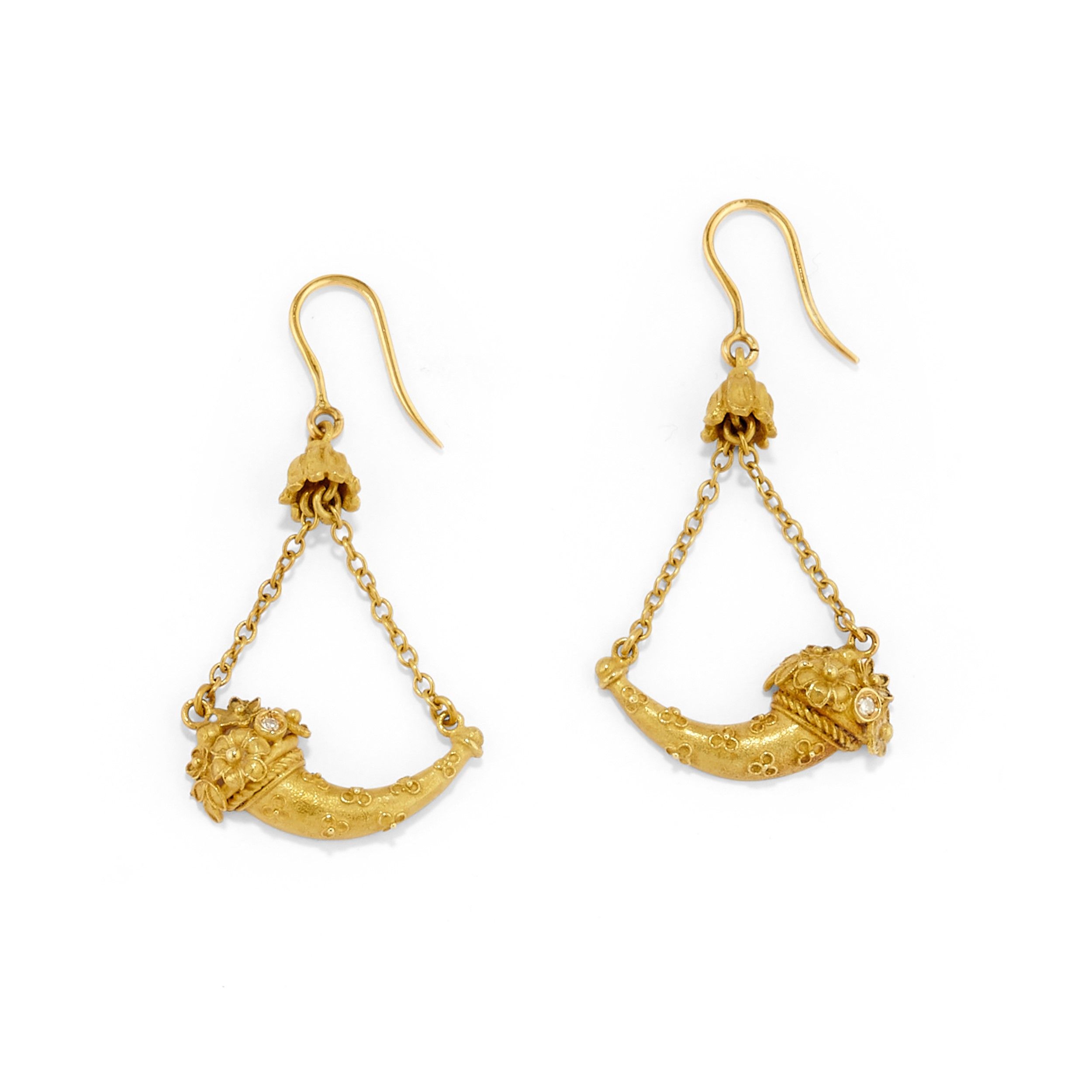 con cornucopie e due piccoli diamanti taglio huit-huit, chiusura a monachella.