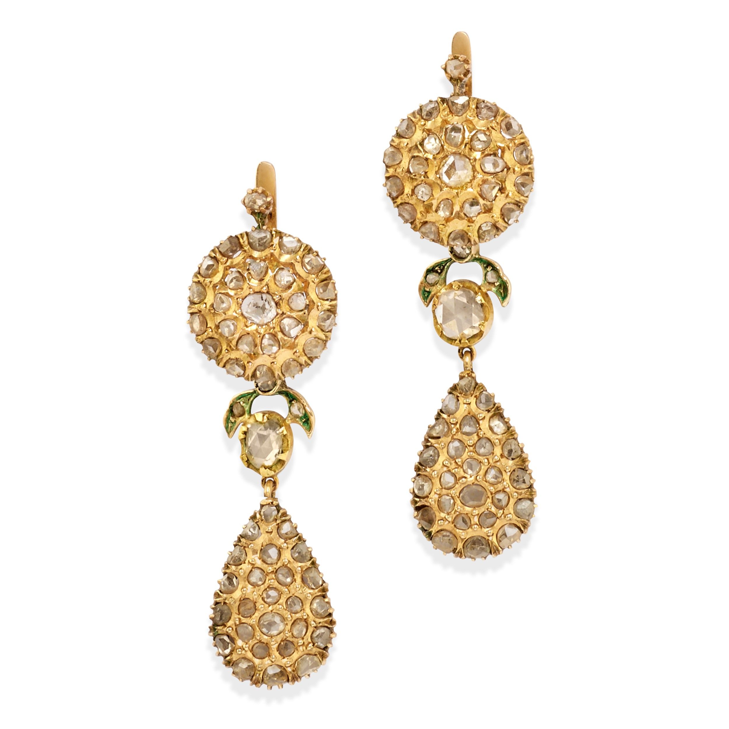 realizzati a doppio corpo, parte superiore a bottone, parte inferiore a goccia e decorati interamente da diamanti taglio rosa, chiusura perno e clip.