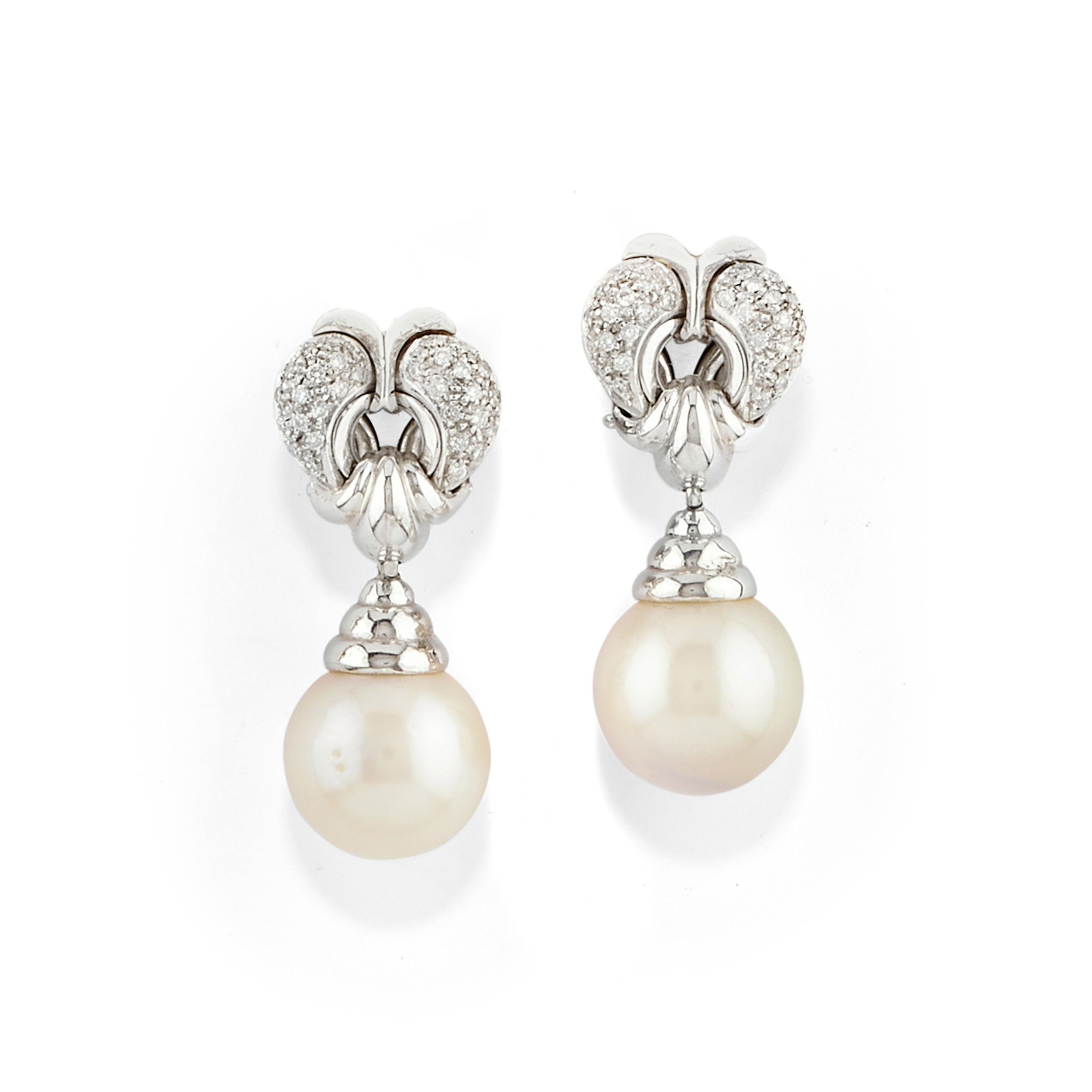 parte superiore con diamanti taglio brillante per totale ct 0,50 circa e parte inferiore con perla coltivata South-Sea di mm 14,00 circa, chiusura a clip, difetti (un diamante mancante).