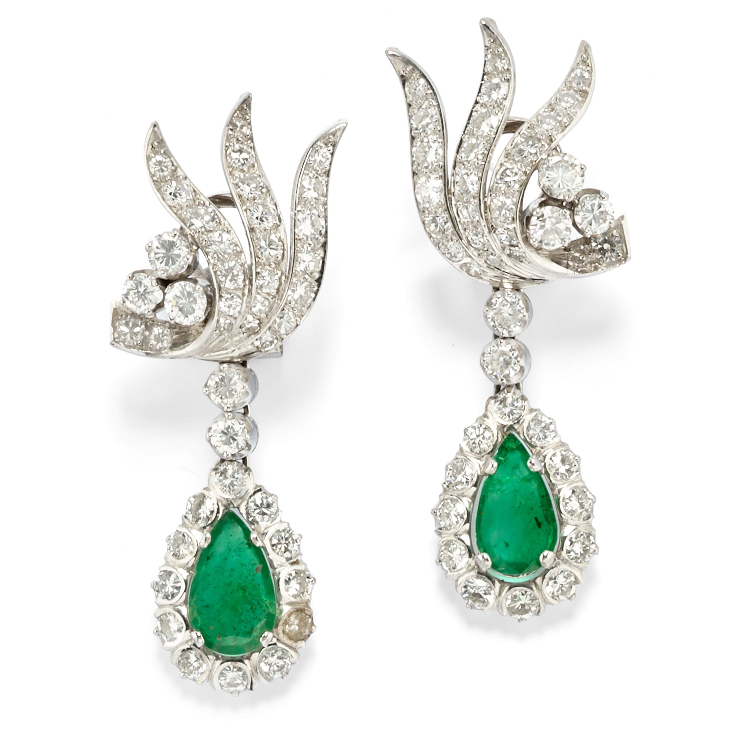 parte superiore a voluta, smeraldi taglio goccia per totale ct 4,00 circa e diamanti taglio brillante per totale ct 8,00 circa, chiusura perno e clip.
