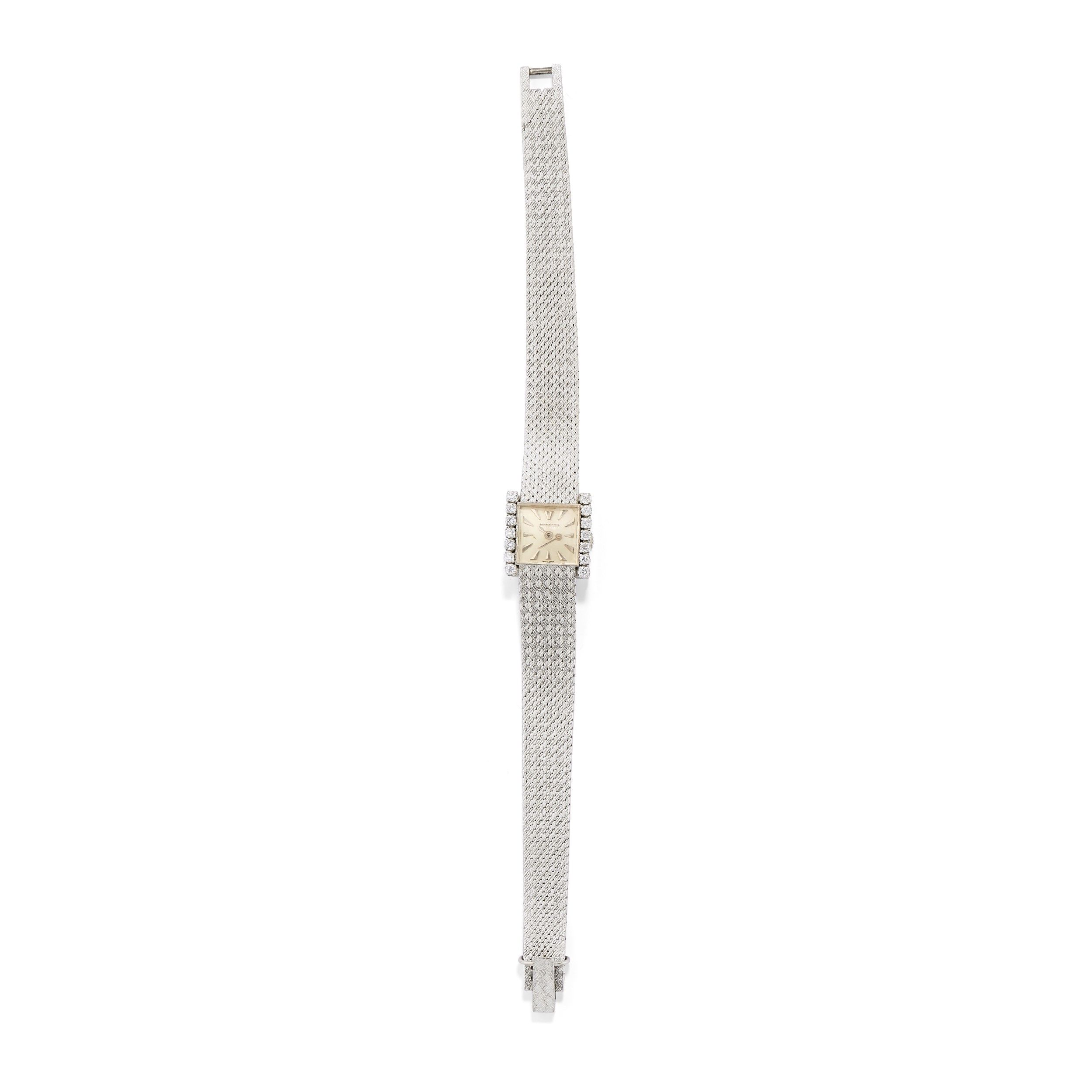 cassa quadrata, quadrante chiaro con indici applicati, movimento a carica manuale, ai lati decoro in diamanti taglio brillante, con astuccio.