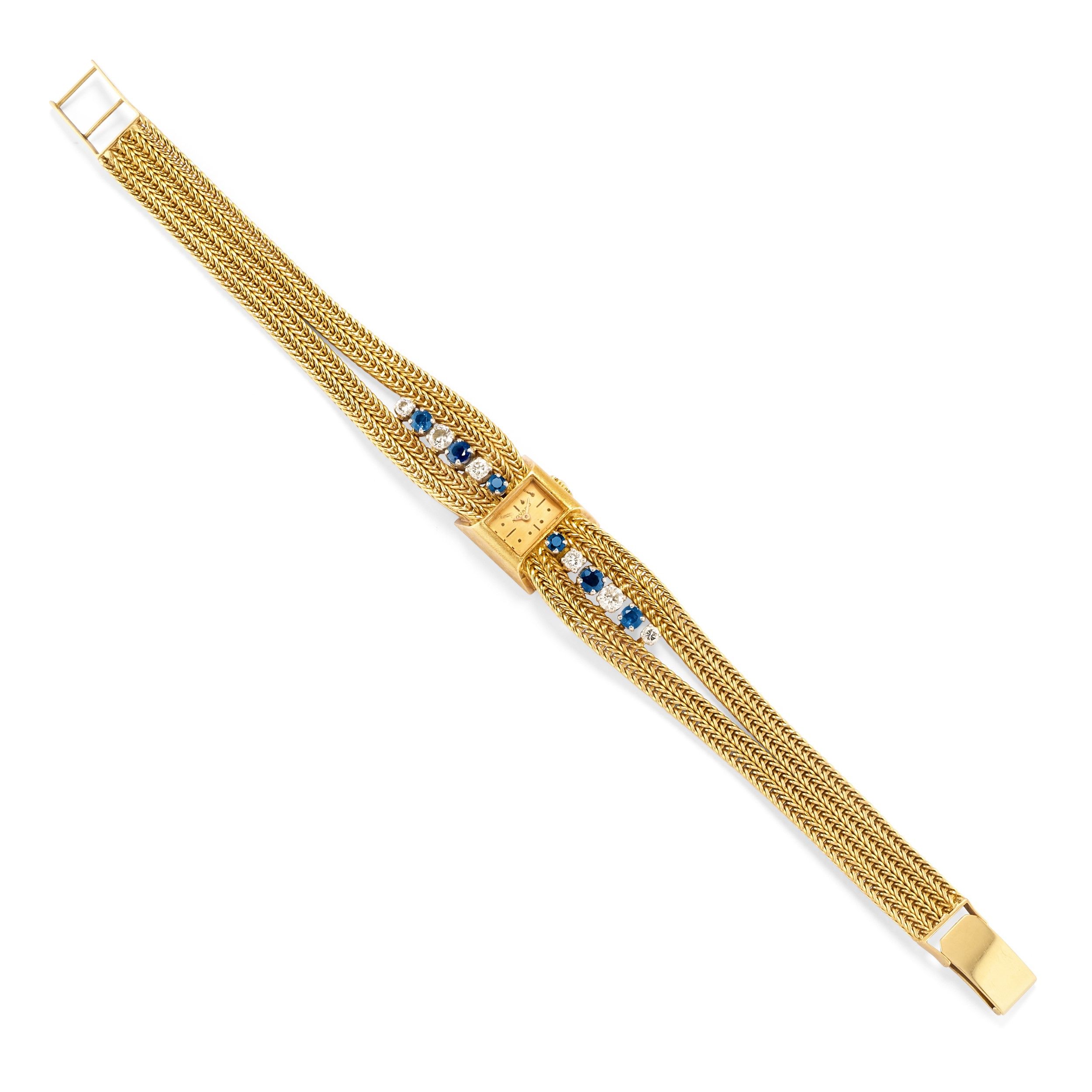 cassa rettangolare, quadrante champagne con indici in smalto nero, movimento a carica manuale, bracciale realizzato con decoro a tessuto, diamanti taglio brillante e zaffiri taglio rotondo, difetti (visibili mancanze di smalto sugli indici).
