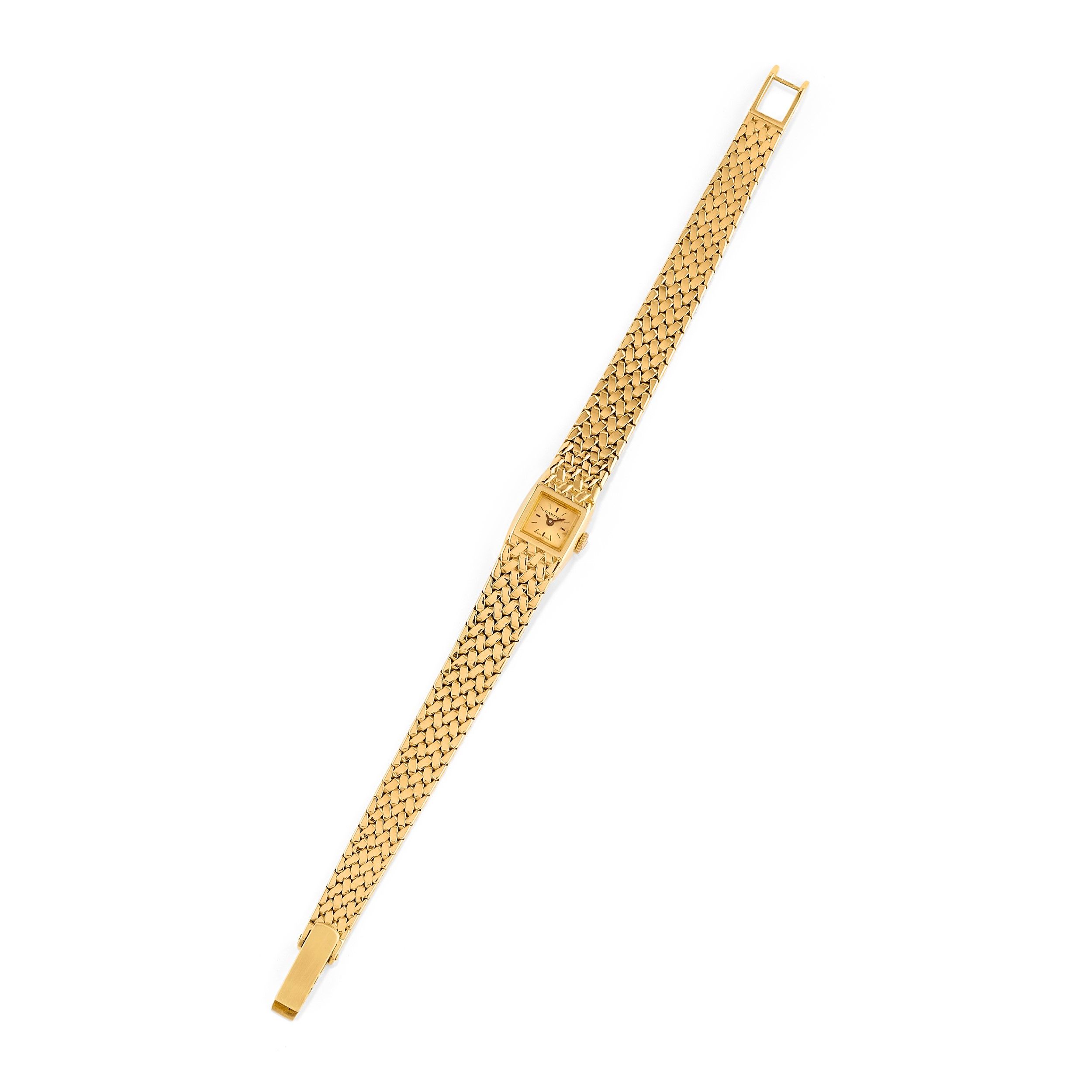 cassa quadrata, quadrante champagne con indici in smalto nero, movimento a carica manuale, quadrante firmato Cartier, meccanismo e fondello firmati Movado.