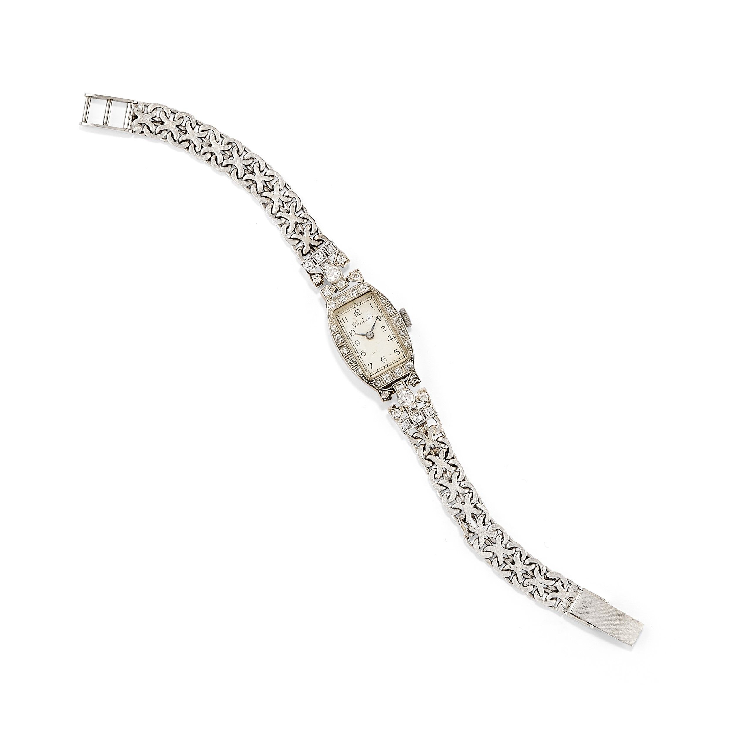 in oro bianco 18k, Peso g 27,60 cm 17,50 cassa tonneau, quadrante chiaro con numeri arabi in smalto nero, movimento a carica manuale, diamanti taglio vecchio e huit-huit incastonati per un totale di ct 0,70 circa, difetto (lieve filatura del quadrante).