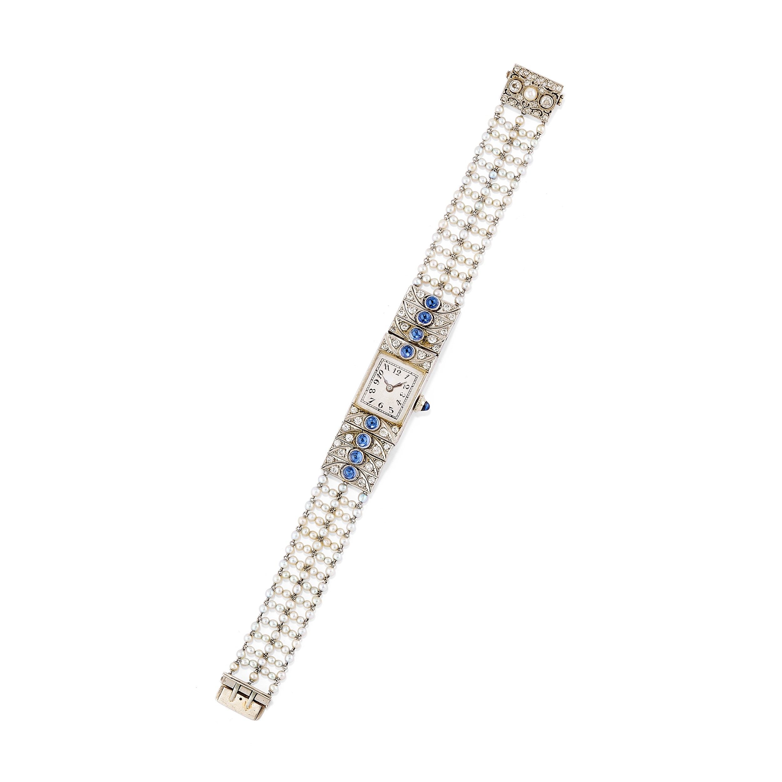 cassa rettangolare, quadrante chiaro con numeri arabi in smalto nero, movimento a carica manuale, zaffiri taglio rotondo cabochon e diamanti a decoro, bracciale in microperle, difetti (non funzionante).