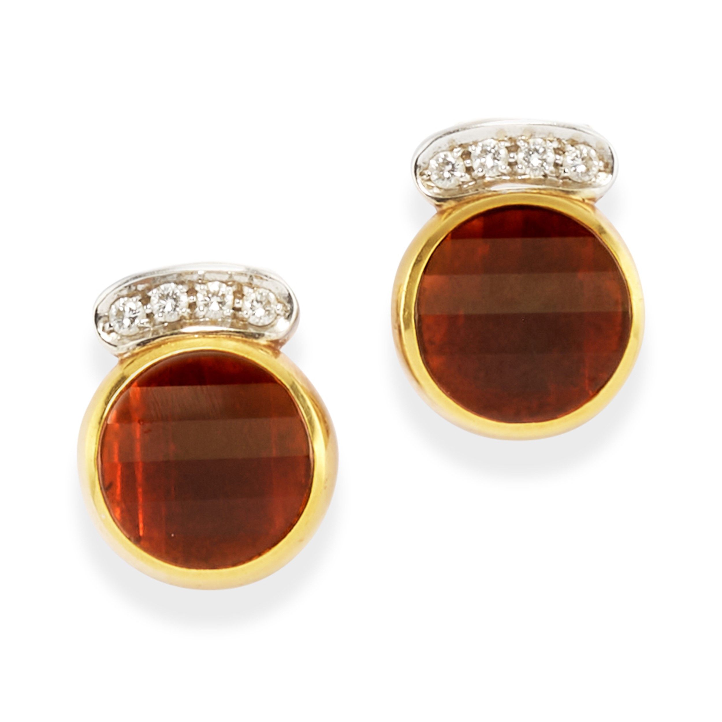 composta da collana e coppia di orecchini con chiusura perno e clip, inserti in granato sfaccettato, diamanti taglio brillante per totale ct 4,00 circa.