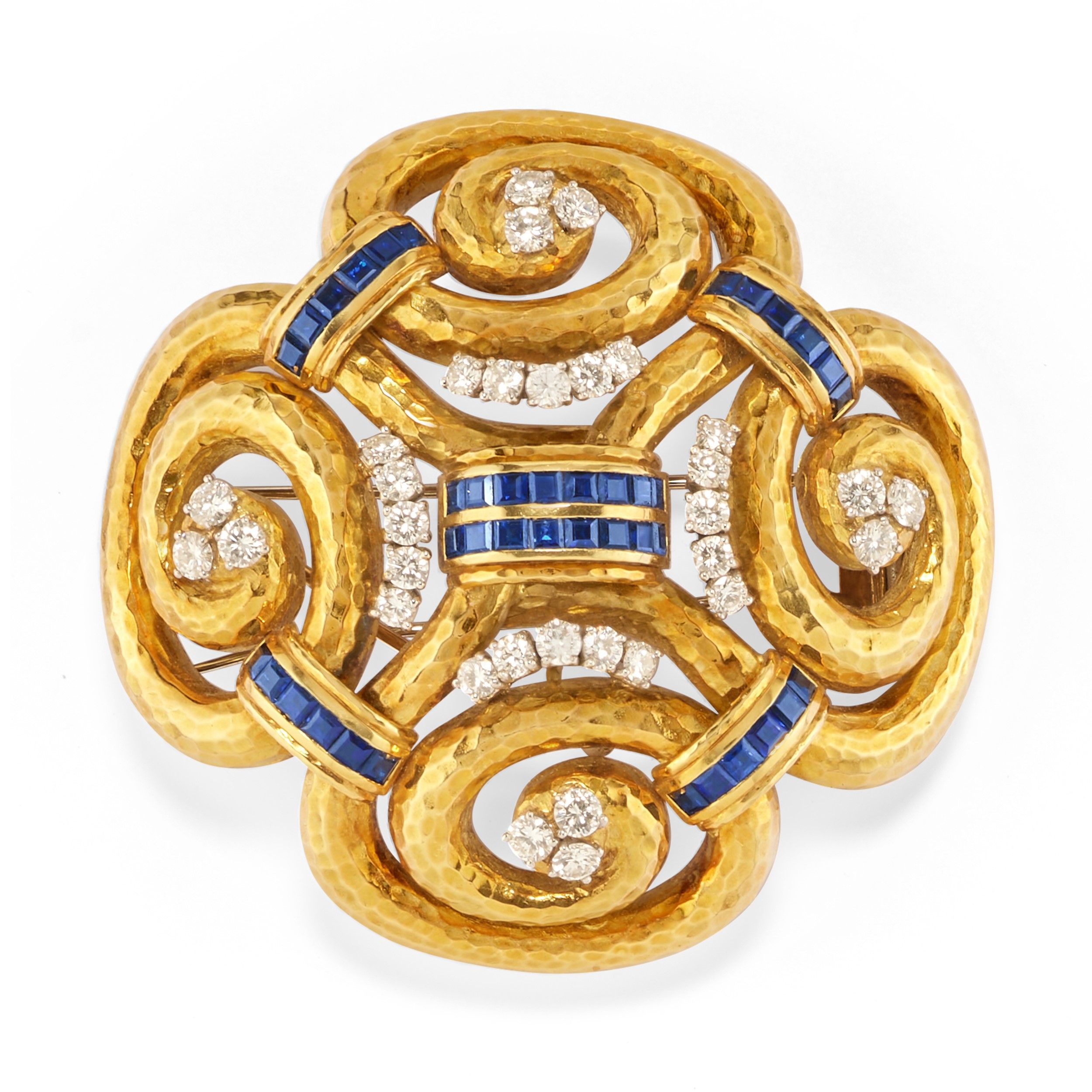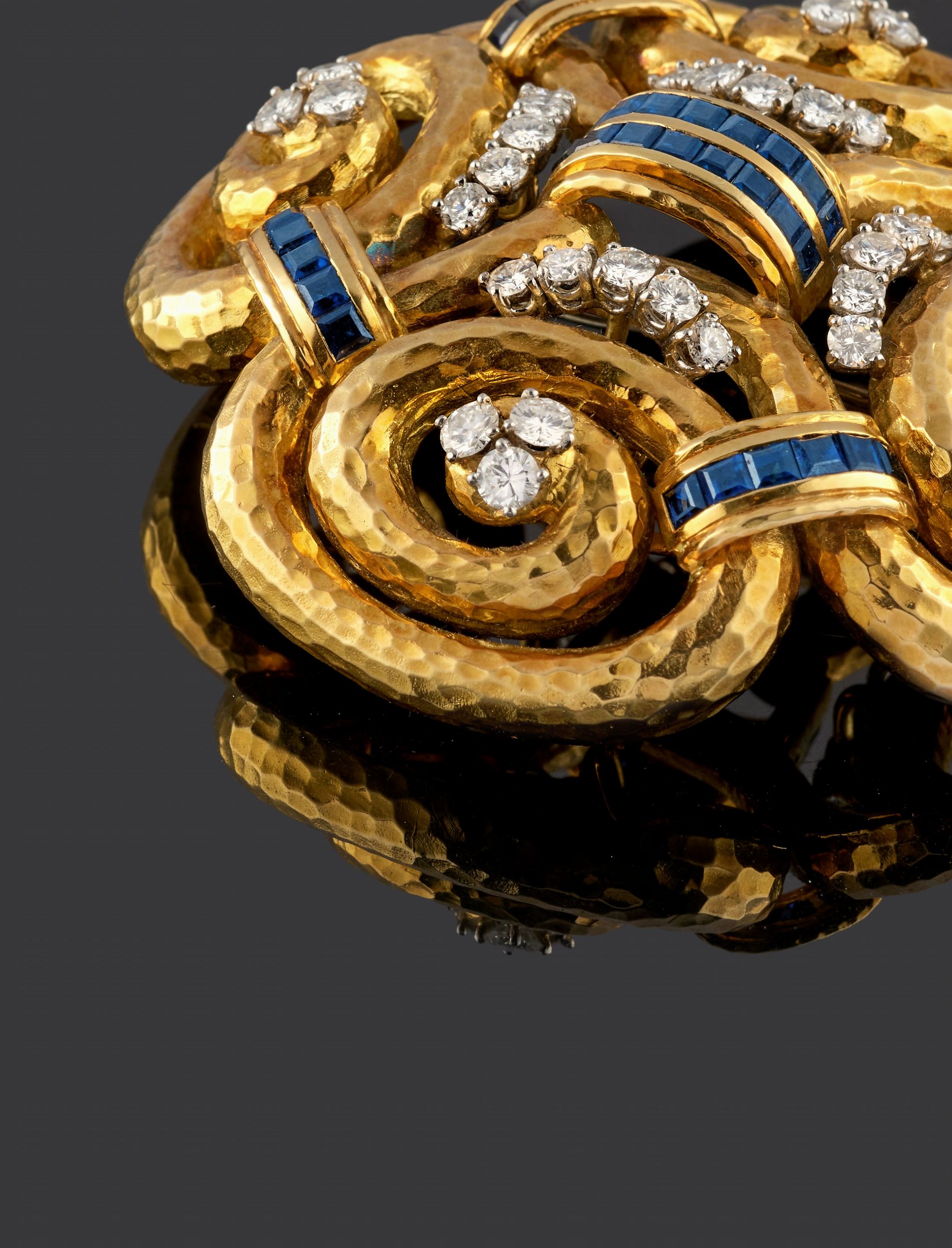 lavorazione dell'oro con decoro martellato, zaffiri taglio carrè incastonati a binario, diamanti taglio brillante per totale ct 6,00 circa.