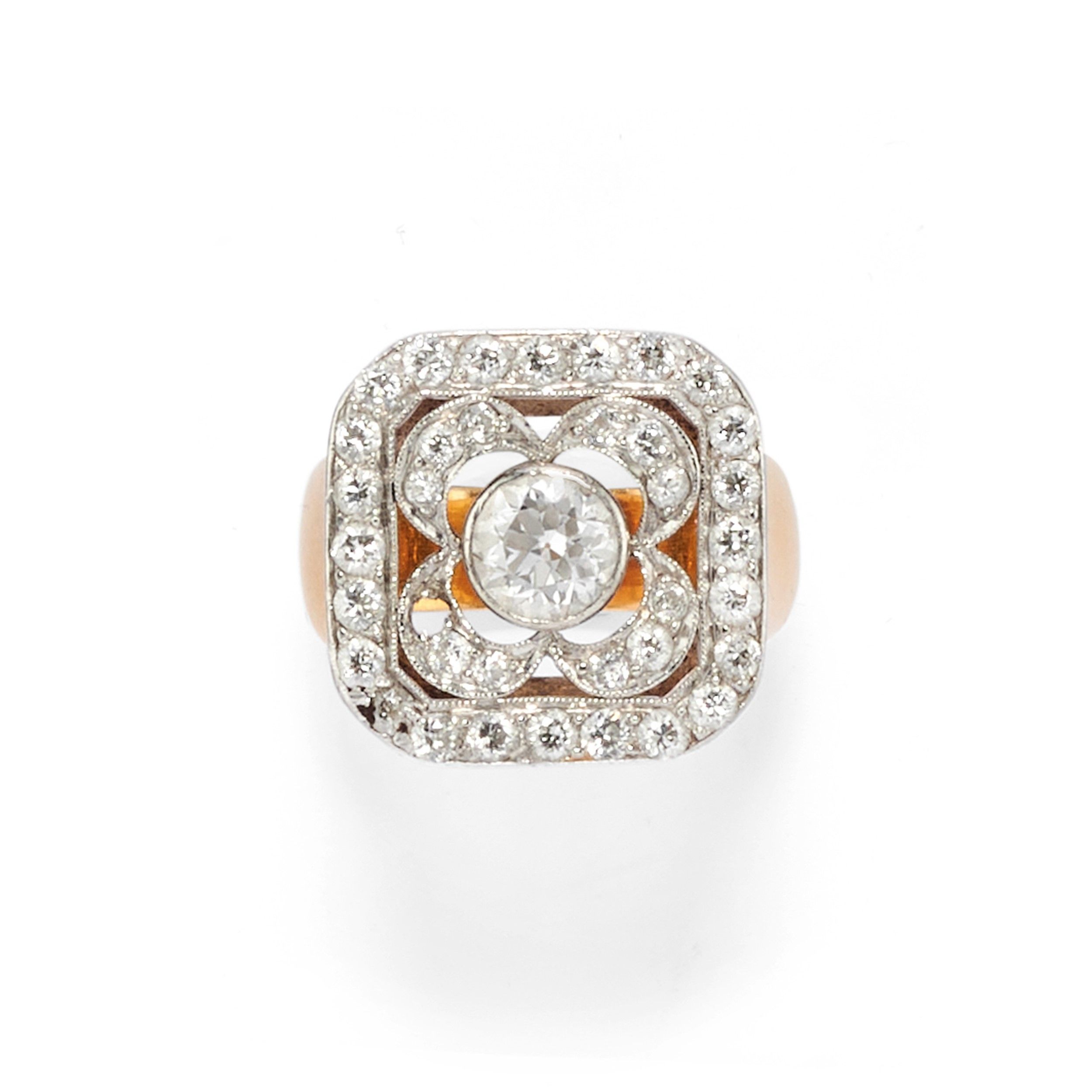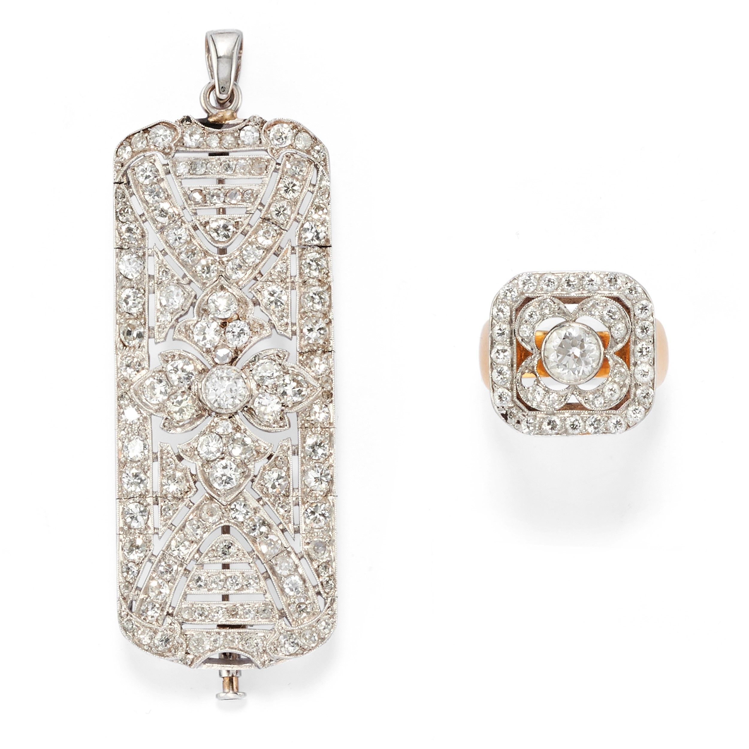 pendente-spilla a saponetta interamente traforata e impreziosita da diamanti taglio vecchio e huit-huit per totale ct 5,00 circa, decoro a milligrano e anello con sommità a cuscino e diamanti taglio vecchio e brillante totale ct 1,00 circa, difetti (diamante mancante).