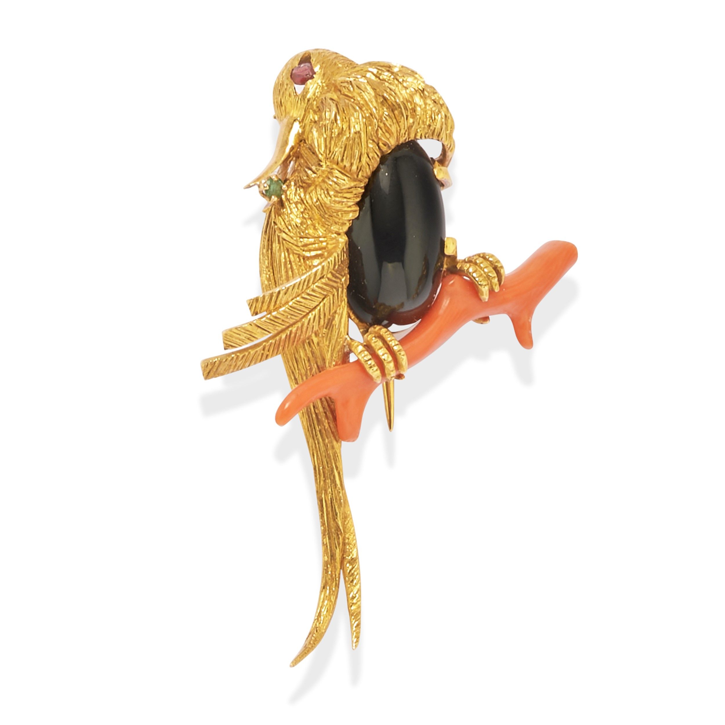 raffigurante uccello, con inserti in onice e corallo, rubino e smeraldo taglio rotondo a decoro.