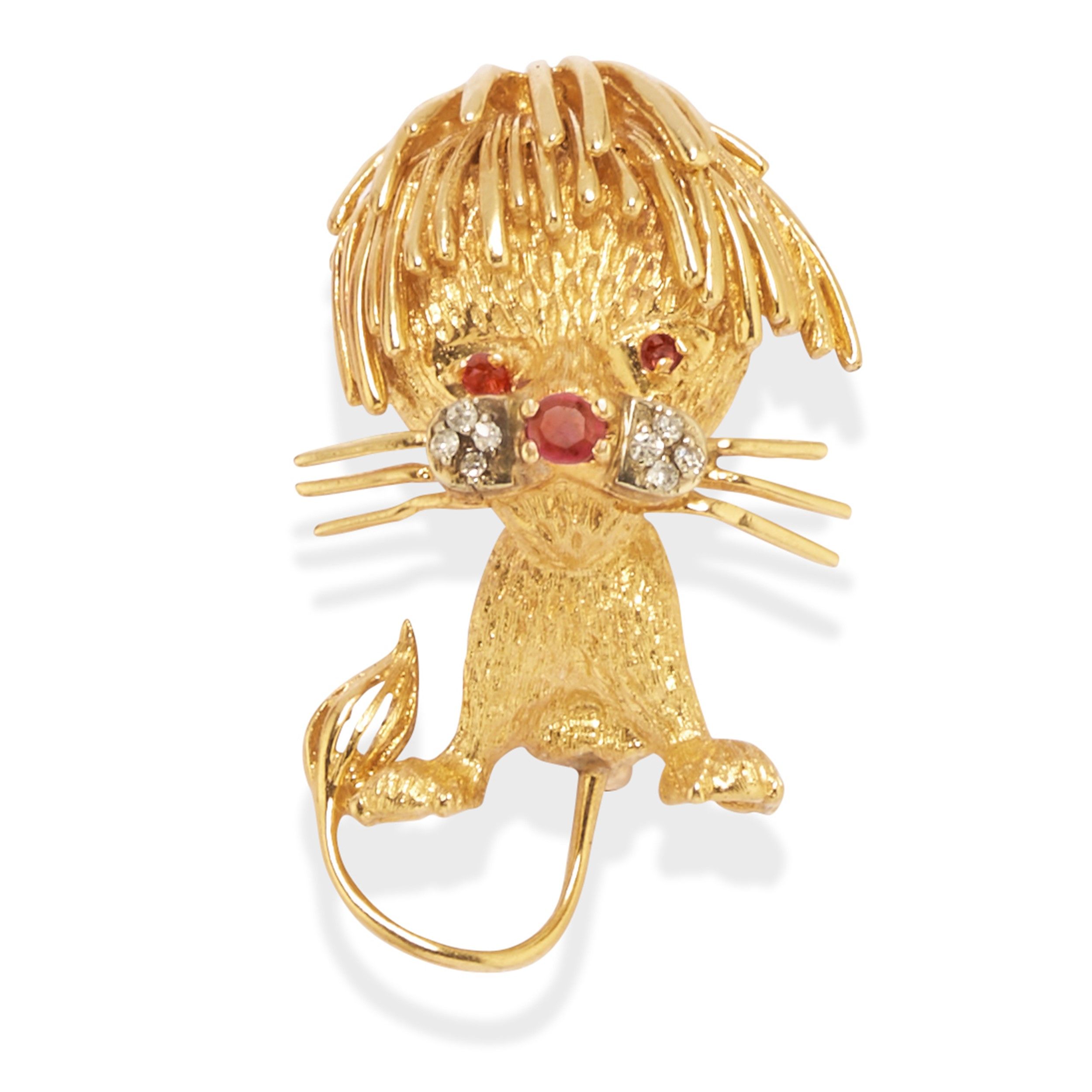 raffigurante leoncino, con rubini taglio rotondo e diamanti taglio huit-huit a decoro.