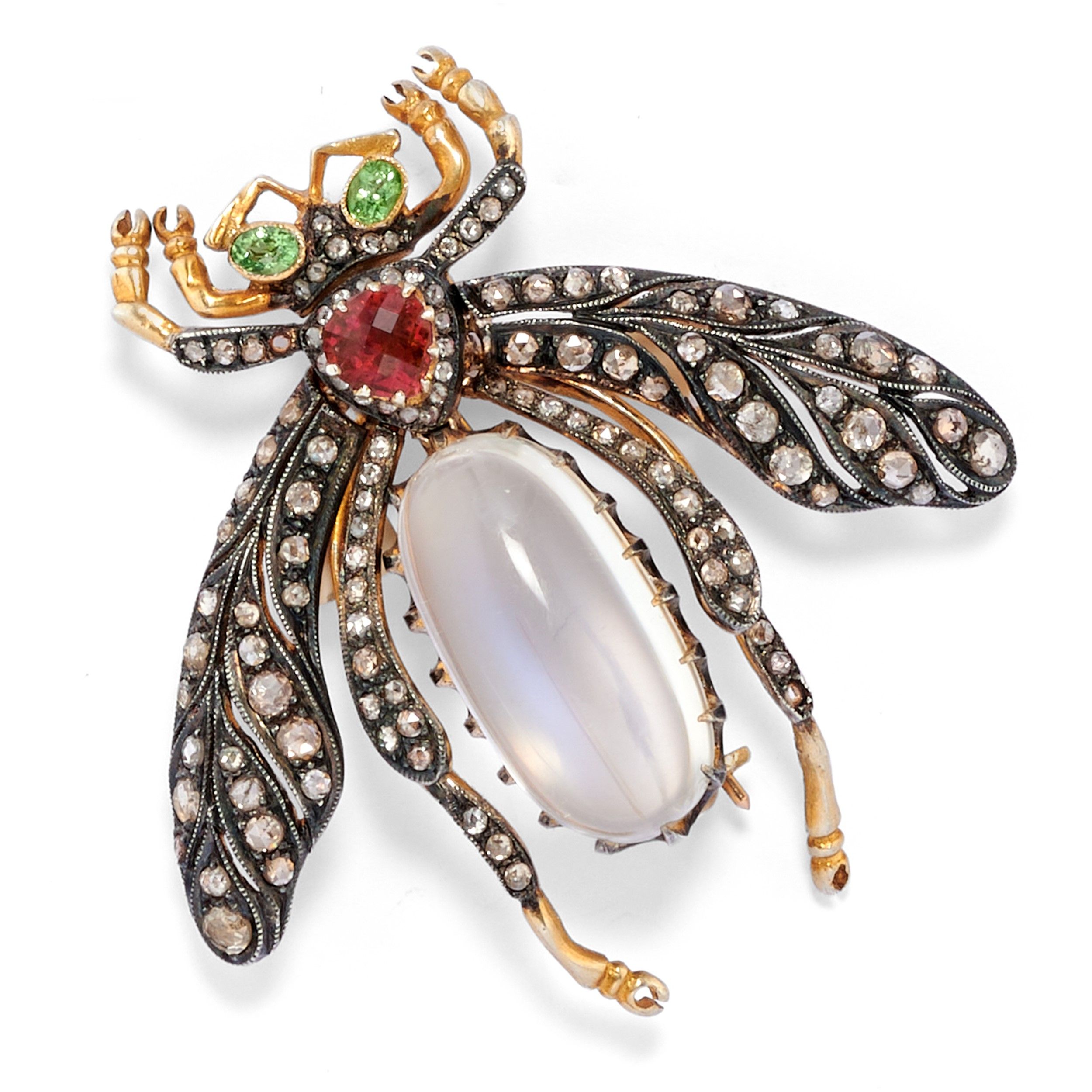 raffigurante mosca con pietra di luna taglio ovale cabochon, rubino, tsavoriti, diamanti taglio rosa, difetti (un diamante mancante).