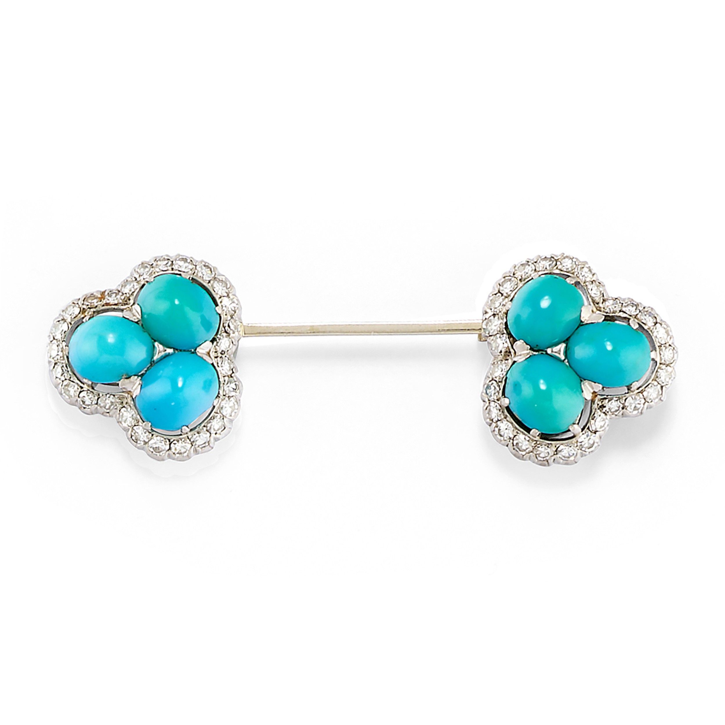 di forma allungata, con terminali a trifoglio trattenenti turchesi taglio ovale cabochon e diamanti taglio huit-huit.